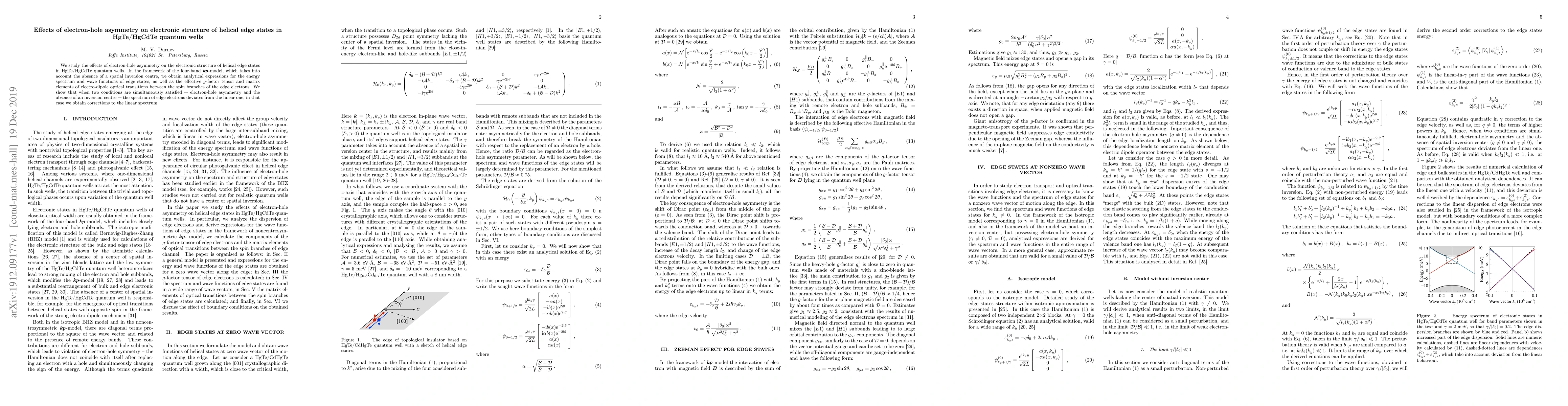 We study the effects of electron-hole asymmetry on the electronic structure of helical edge states in HgTe/HgCdTe quantum wells. In the framework of the four-band kp-model, which takes into account the absence of a spatial inversion centre, we obtain analytical expressions for the energy spectrum and wave functions of edge states, as well as the effective g-factor tensor and matrix elements of electro-dipole optical transitions between the spin branches of the edge electrons. We show that when two conditions are simultaneously satisfied -- electron-hole asymmetry and the absence of an inversion centre -- the spectrum of edge electrons deviates from the linear one, in that case we obtain corrections to the linear spectrum.