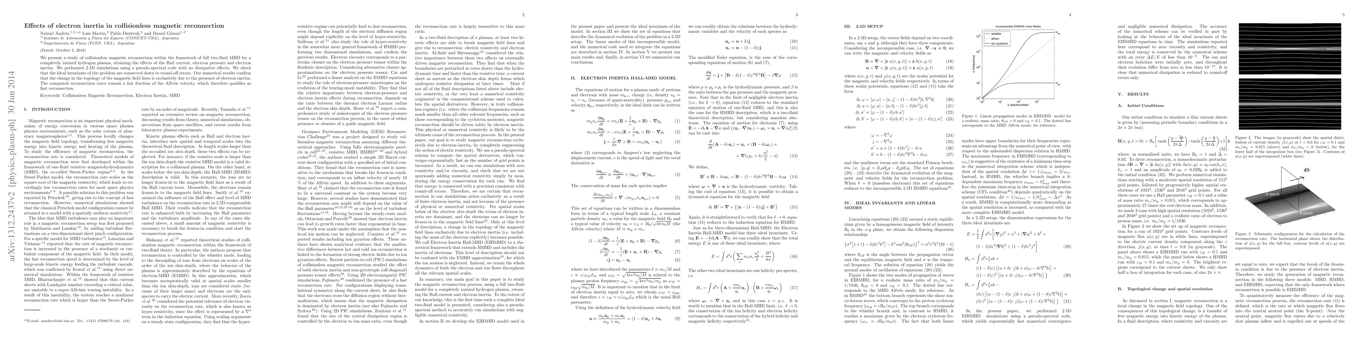 We present a study of collisionless magnetic reconnection within the framework of full two-fluid MHD for a completely ionized hydrogen plasma, retaining the effects of the Hall current, electron pressure and electron inertia. We performed 2.5D simulations using a pseudo-spectral code with no dissipative effects. We check that the ideal invariants of the problem are conserved down to round-off errors. Our results show that the change in the topology of the magnetic field lines is exclusively due to the presence of electron inertia. The computed reconnection rates remain a fair fraction of the Alfv\'en velocity, which therefore qualifies as fast reconnection.