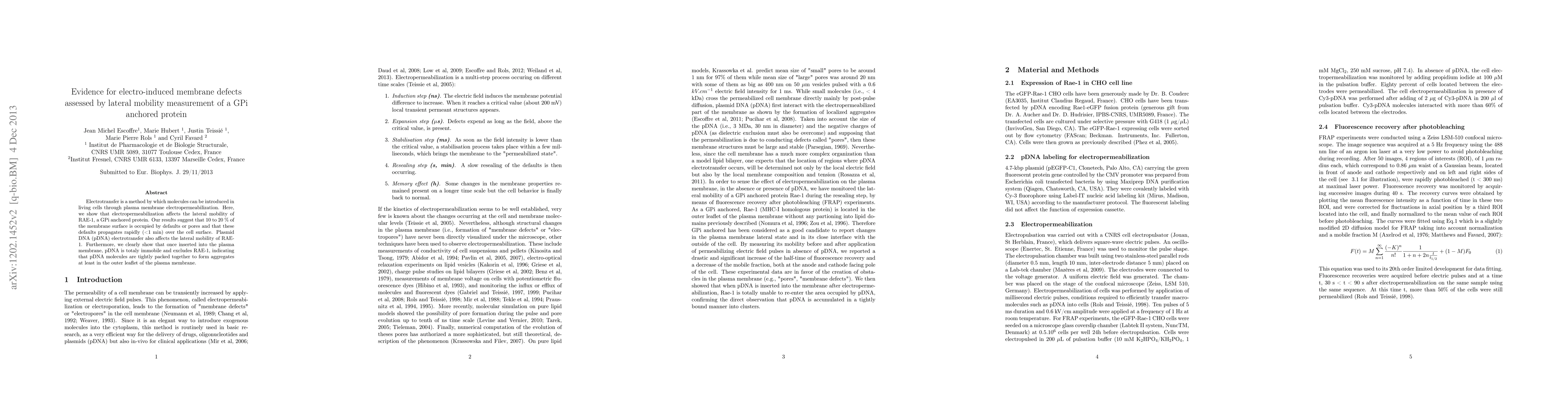 Summary: This study investigates how electropermeabilization and gene electrotransfert influence the lateral mobility of the GPi anchored protein Rae-1. It finds that electropermeabilization creates pores occupying 10-20% of the membrane surface, and gene electrotransfert alters Rae-1 mobility, with DNA molecules forming dense aggregates that exclude Rae-1.