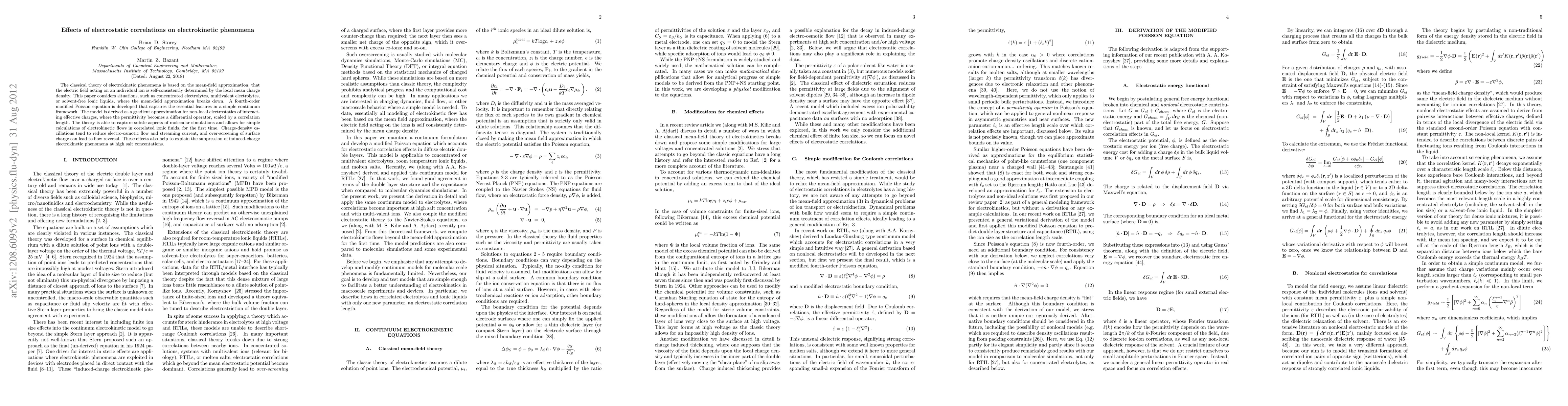 The research develops a continuum model for electrokinetic phenomena that accounts for electrostatic correlations, applying it to electro-osmotic flow and streaming current in aqueous electrolytes with high valence and high salt concentration at a flat, homogeneously charged surface.