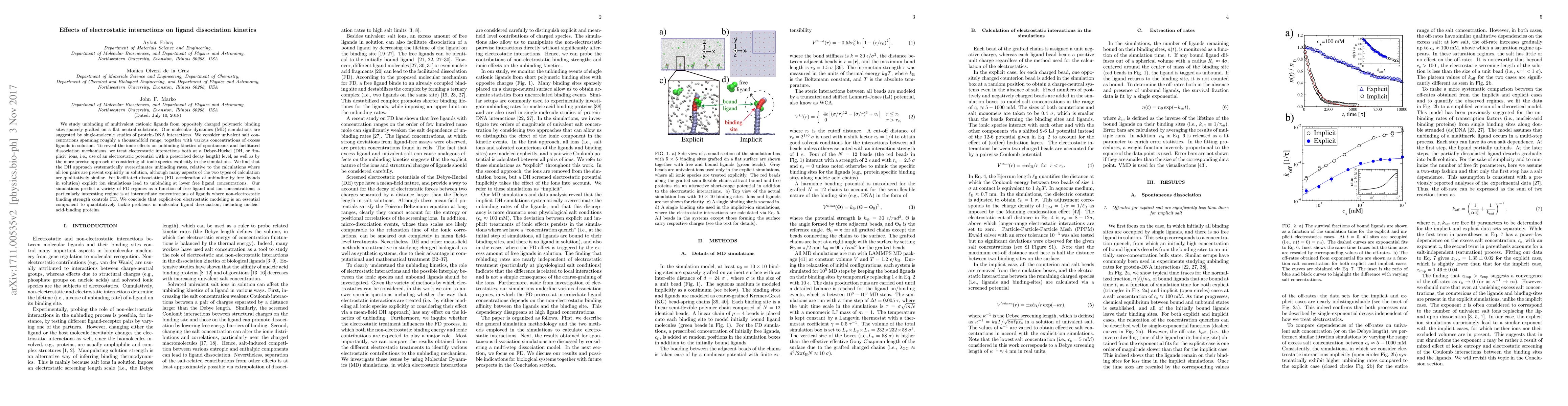 We study unbinding of multivalent cationic ligands from oppositely charged polymeric binding sites sparsely grafted on a flat neutral substrate. Our molecular dynamics (MD) simulations are suggested by single-molecule studies of protein-DNA interactions. We consider univalent salt concentrations spanning roughly a thousandfold range, together with various concentrations of excess ligands in solution. To reveal the ionic effects on unbinding kinetics of spontaneous and facilitated dissociation mechanisms, we treat electrostatic interactions both at a Debye-H\"{u}ckel (DH, or `implicit' ions, i.e., use of an electrostatic potential with a prescribed decay length) level, as well as by the more precise approach of considering all ionic species explicitly in the simulations. We find that the DH approach systematically overestimates unbinding rates, relative to the calculations where all ion pairs are present explicitly in solution, although many aspects of the two types of calculation are qualitatively similar. For facilitated dissociation (FD, acceleration of unbinding by free ligands in solution) explicit ion simulations lead to unbinding at lower free ligand concentrations. Our simulations predict a variety of FD regimes as a function of free ligand and ion concentrations; a particularly interesting regime is at intermediate concentrations of ligands where non-electrostatic binding strength controls FD. We conclude that explicit-ion electrostatic modeling is an essential component to quantitatively tackle problems in molecular ligand dissociation, including nucleic-acid-binding proteins.