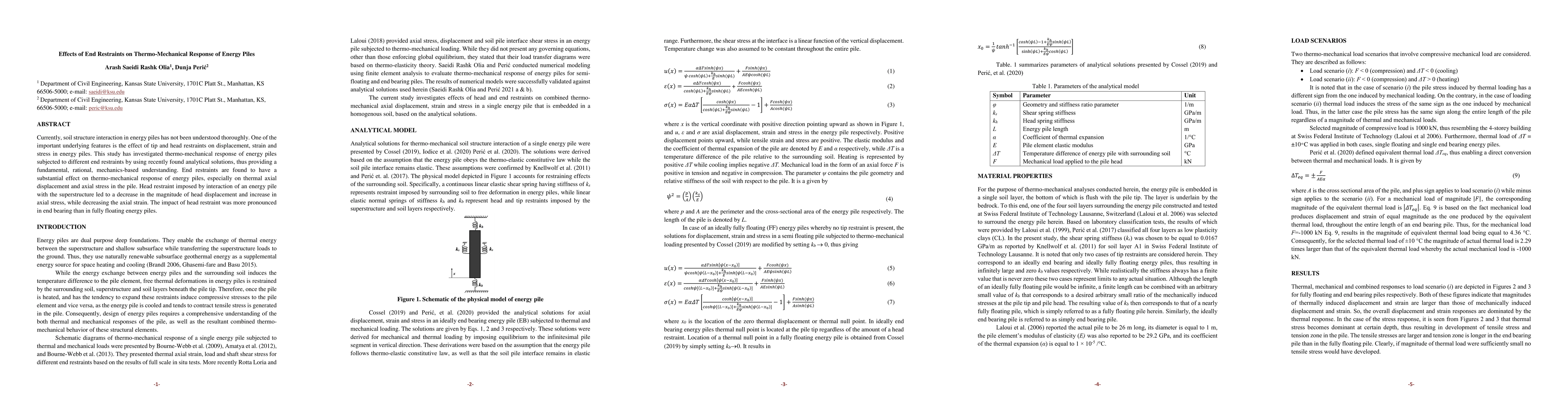 This study investigates the thermo-mechanical response of energy piles under various end restraints, revealing significant effects on thermal axial displacement and axial stress. Head restraint notably reduces head displacement and increases axial stress, with more pronounced effects in end-bearing piles compared to fully floating ones.