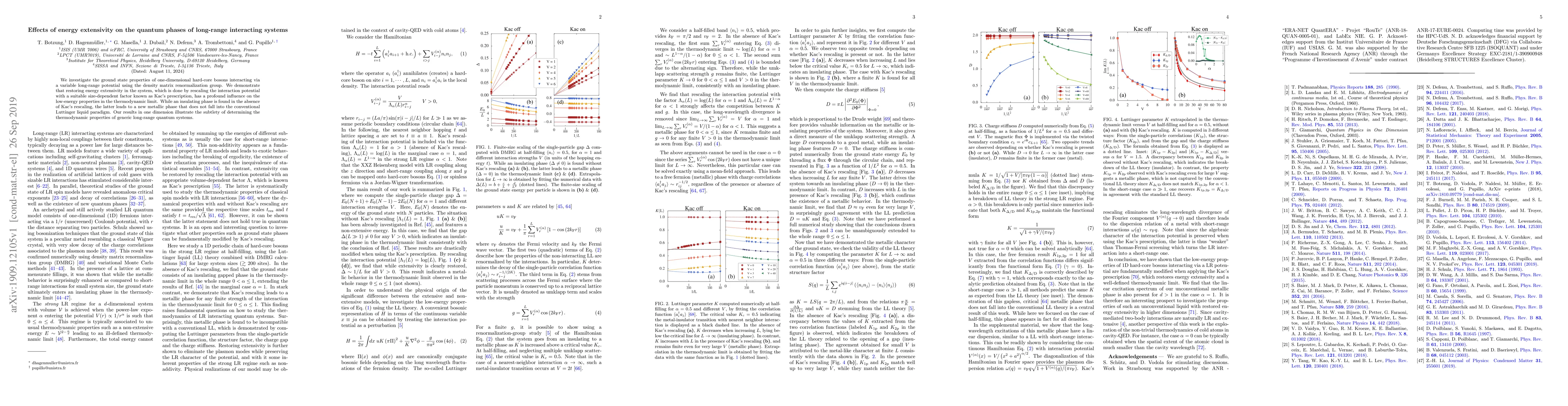 We investigate the ground state properties of one-dimensional hard-core bosons interacting via a variable long-range potential using the density matrix renormalization group. We demonstrate that restoring energy extensivity in the system, which is done by rescaling the interaction potential with a suitable size-dependent factor known as Kac's prescription, has a profound influence on the low-energy properties in the thermodynamic limit. While an insulating phase is found in the absence of Kac's rescaling, the latter leads to a new metallic phase that does not fall into the conventional Luttinger liquid paradigm. Our results in one dimension illustrate the subtlety of determining the thermodynamic properties of generic long-range quantum systems.