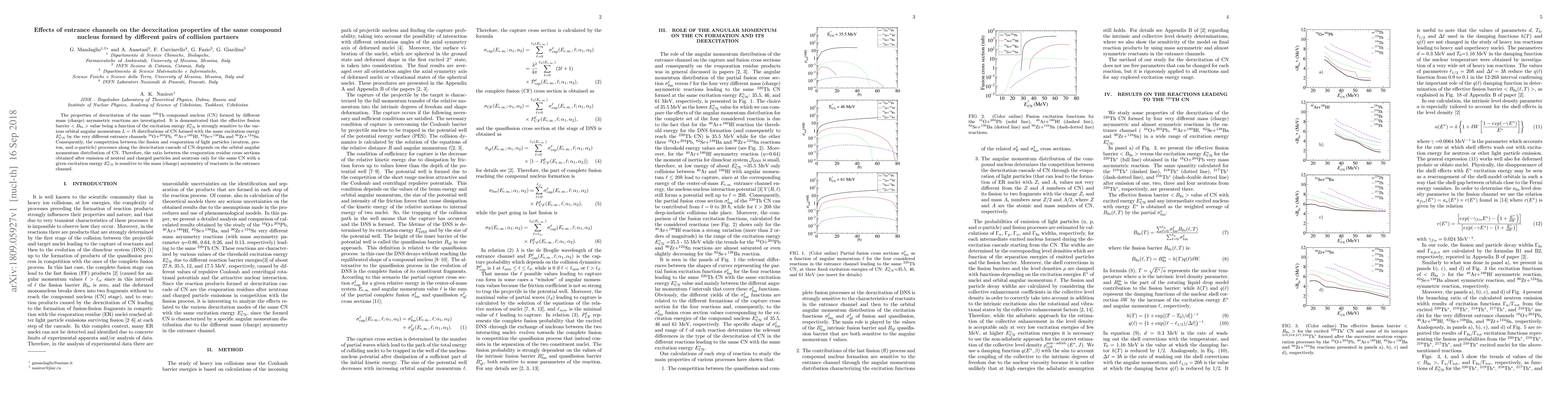 This study investigates how different entrance channels affect the deexcitation properties of the same $^{220}$Th compound nucleus, revealing that the effective fission barrier varies significantly with different orbital angular momentum distributions despite the same excitation energy. The competition between fission and particle evaporation processes is influenced by the mass asymmetry of the initial reactions.