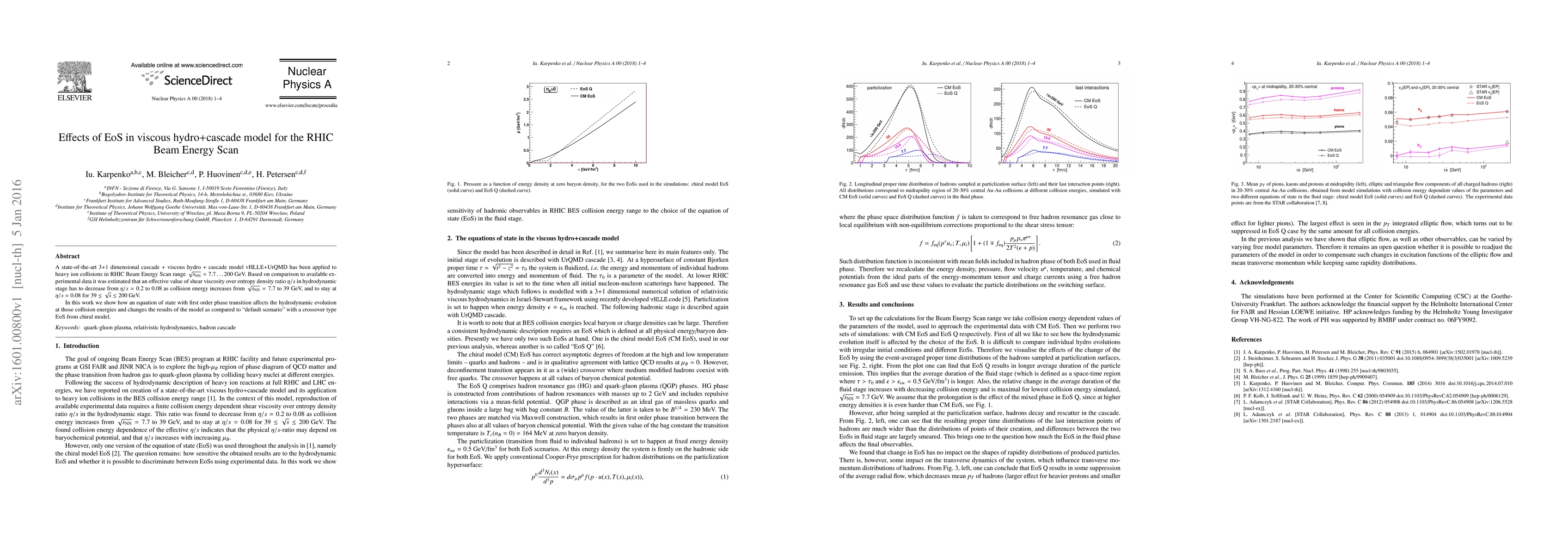 This study employs a hybrid viscous hydrodynamic and cascade model to analyze heavy ion collisions at RHIC energies, finding that the shear viscosity ratio $\eta/s$ decreases with increasing collision energy. It also investigates the impact of an equation of state with a first-order phase transition on the model's predictions compared to a crossover scenario.