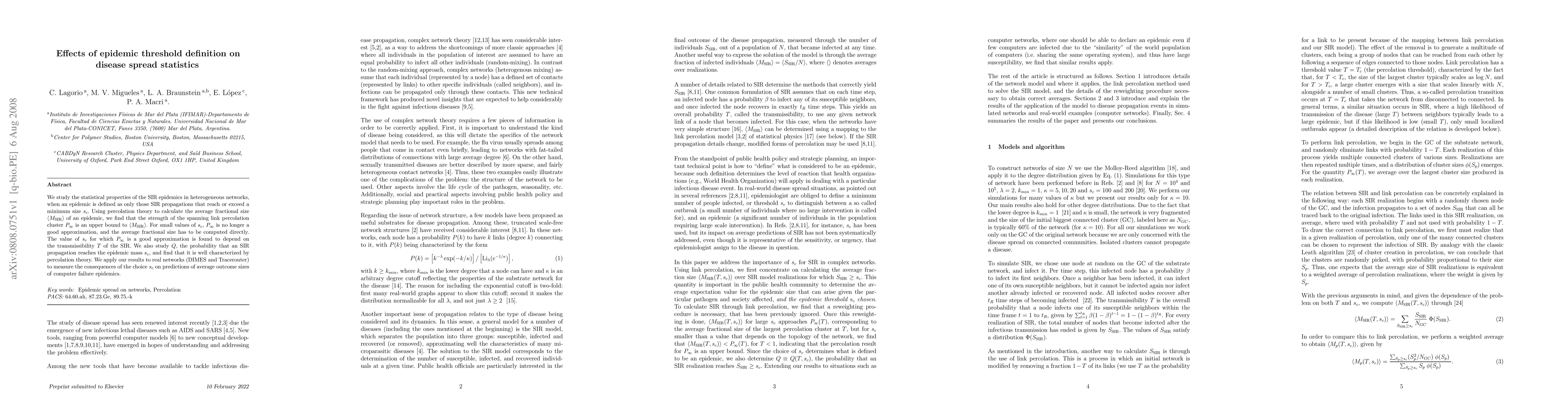 networks, when an epidemic is defined as only those SIR propagations that reach