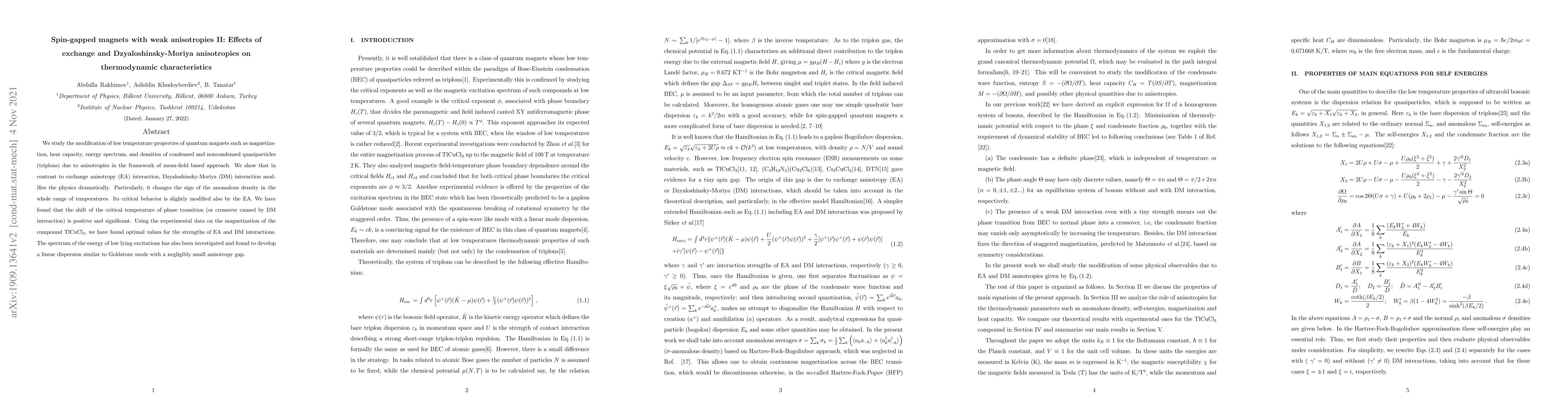 We study the modification of low temperature properties of quantum magnets such as magnetization, heat capacity, energy spectrum, and densities of condensed and noncondensed quasiparticles (triplons) due to anisotropies in the framework of mean-field based approach. We show that in contrast to exchange anisotropy (EA) interaction, Dzyaloshinsky-Moriya (DM) interaction modifies the physics dramatically. Particularly, it changes the sign of the anomalous density in the whole range of temperatures. Its critical behavior is slightly modified also by the EA. We have found that the shift of the critical temperature of phase transition (or crossover caused by DM interaction) is positive and significant. Using the experimental data on the magnetization of the compound TlCuCl$_3$, we have found optimal values for the strengths of EA and DM interactions. The spectrum of the energy of low lying excitations has also been investigated and found to develop a linear dispersion similar to Goldstone mode with a negligibly small anisotropy gap.