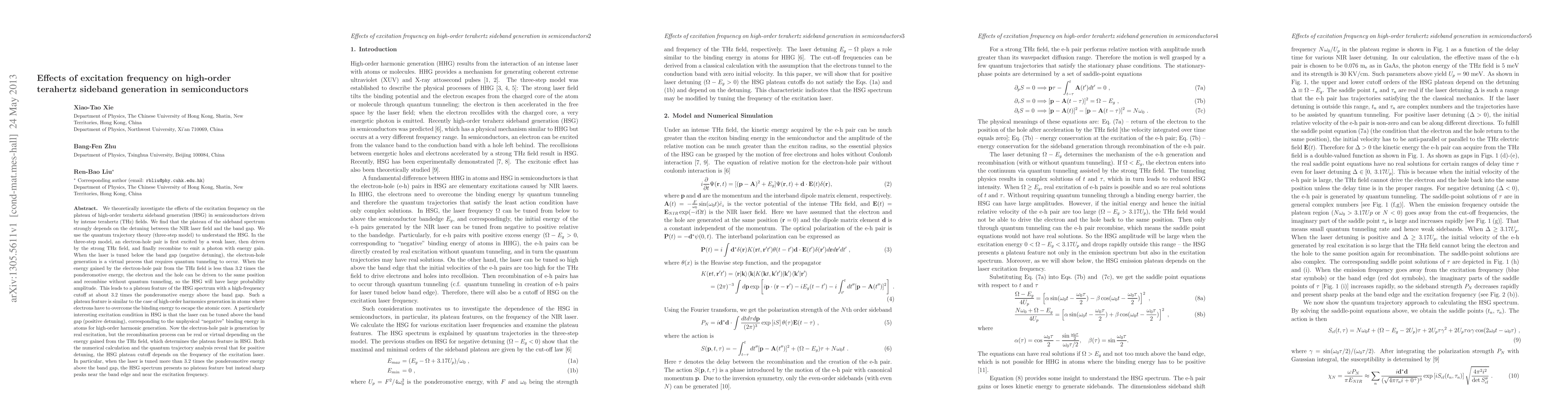 We theoretically investigate the effects of the excitation frequency on the plateau of high-order terahertz sideband generation (HSG) in semiconductors driven by intense terahertz (THz) fields. We find that the plateau of the sideband spectrum strongly depends on the detuning between the NIR laser field and the band gap. We use the quantum trajectory theory (three-step model) to understand the HSG. In the three-step model, an electron-hole pair is first excited by a weak laser, then driven by the strong THz field, and finally recombine to emit a photon with energy gain. When the laser is tuned below the band gap (negative detuning), the electron-hole generation is a virtual process that requires quantum tunneling to occur. When the energy gained by the electron-hole pair from the THz field is less than 3.2 times the ponderomotive energy, the electron and the hole can be driven to the same position and recombine without quantum tunneling, so the HSG will have large probability amplitude. This leads to a plateau feature of the HSG spectrum with a high-frequency cutoff at about 3.2 times the ponderomotive energy above the band gap. Such a plateau feature is similar to the case of high-order harmonics generation in atoms where electrons have to overcome the binding energy to escape the atomic core. A particularly interesting excitation condition in HSG is that the laser can be tuned above the band gap (positive detuning), corresponding to the unphysical "negative" binding energy in atoms for high-order harmonic generation. Now the electron-hole pair is generation by real excitation, but the recombination process can be real or virtual depending on the energy gained from the THz field, which determines the plateau feature in HSG.