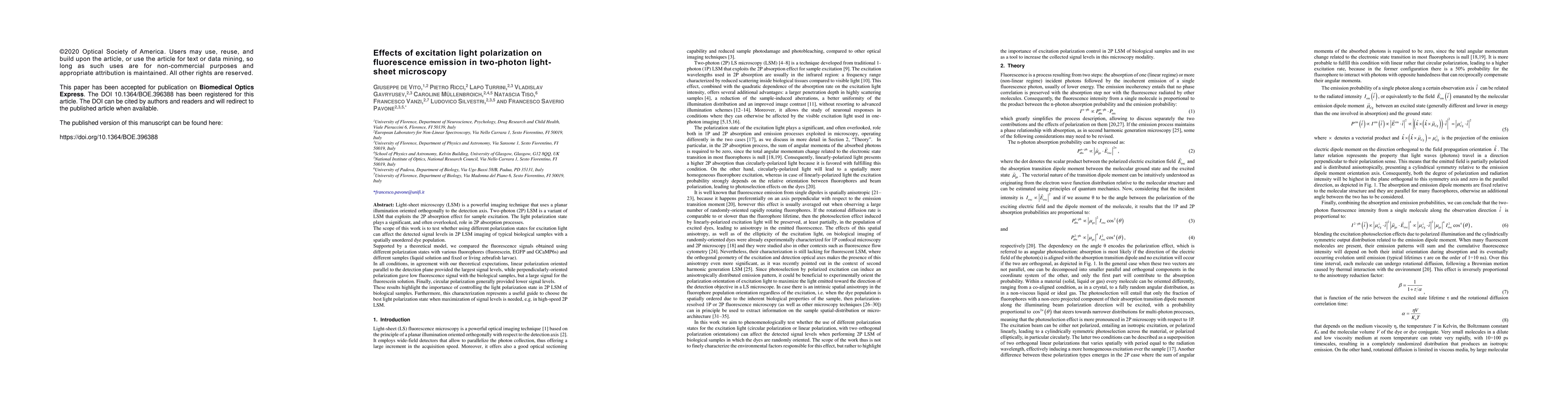 This study investigates the impact of excitation light polarization on fluorescence emission in two-photon light-sheet microscopy (2P LSM). Results show that linear polarization parallel to the detection plane maximizes signal levels, while perpendicular polarization yields lower signals in biological samples but higher in fluorescein solutions. Circular polarization generally provides lower signal levels, emphasizing the importance of polarization state control for optimal 2P LSM imaging.