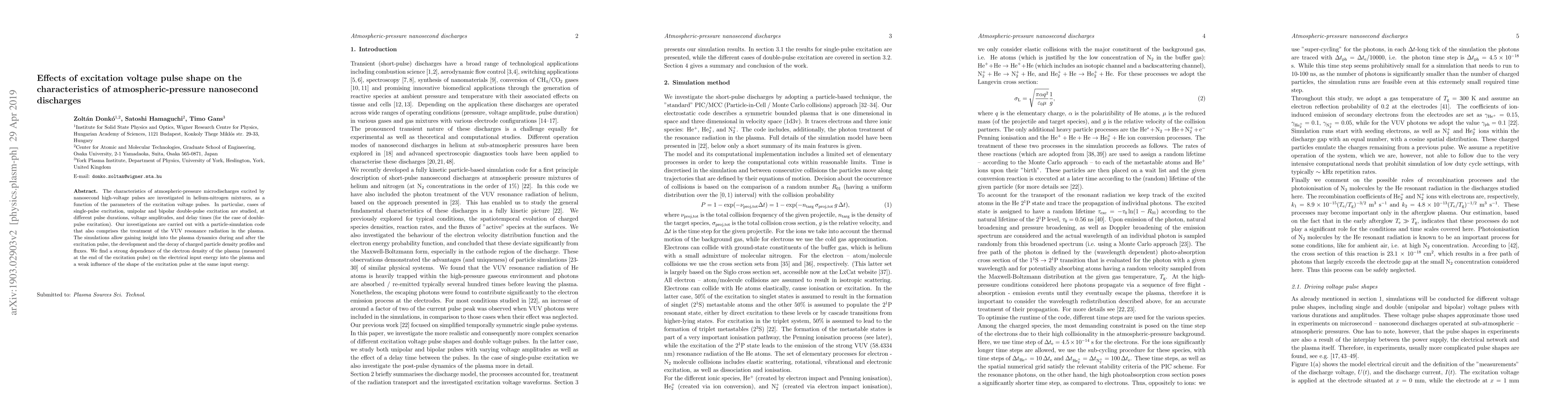 The characteristics of atmospheric-pressure microdischarges excited by nanosecond high-voltage pulses are investigated in helium-nitrogen mixtures, as a function of the parameters of the excitation voltage pulses. In particular, cases of single-pulse excitation, unipolar and bipolar double-pulse excitation are studied, at different pulse durations, voltage amplitudes, and delay times (for the case of double-pulse excitation). Our investigations are carried out with a particle-simulation code that also comprises the treatment of the VUV resonance radiation in the plasma. The simulations allow gaining insight into the plasma dynamics during and after the excitation pulse, the development and the decay of charged particle density profiles and fluxes. We find a strong dependence of the electron density of the plasma (measured at the end of the excitation pulse) on the electrical input energy into the plasma and a weak influence of the shape of the excitation pulse at the same input energy.