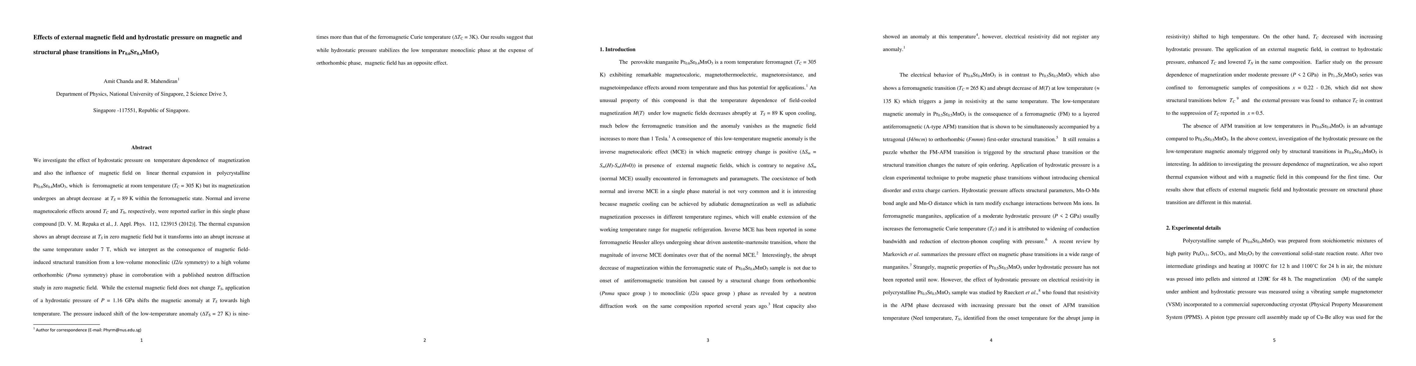 Researchers investigated how pressure and magnetic fields affect the behavior of a specific manganese oxide material, finding that hydrostatic pressure shifts its magnetic anomaly to higher temperatures while external magnetic fields induce structural transitions at certain pressures.
