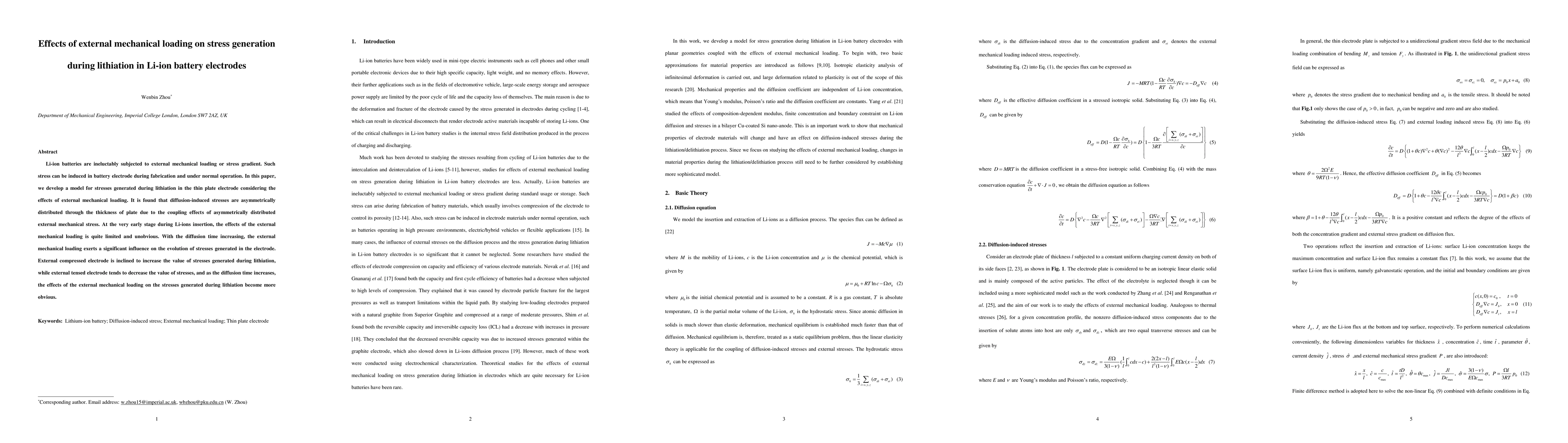 Li-ion batteries are ineluctably subjected to external mechanical loading or stress gradient. Such stress can be induced in battery electrode during fabrication and under normal operation. In this paper, we develop a model for stresses generated during lithiation in the thin plate electrode considering the effects of external mechanical loading. It is found that diffusion-induced stresses are asymmetrically distributed through the thickness of plate due to the coupling effects of asymmetrically distributed external mechanical stress. At the very early stage during Li-ions insertion, the effects of the external mechanical loading is quite limited and unobvious. With the diffusion time increasing, the external mechanical loading exerts a significant influence on the evolution of stresses generated in the electrode. External compressed electrode is inclined to increase the value of stresses generated during lithiation, while external tensed electrode tends to decrease the value of stresses, and as the diffusion time increases, the effects of the external mechanical loading on the stresses generated during lithiation become more obvious.