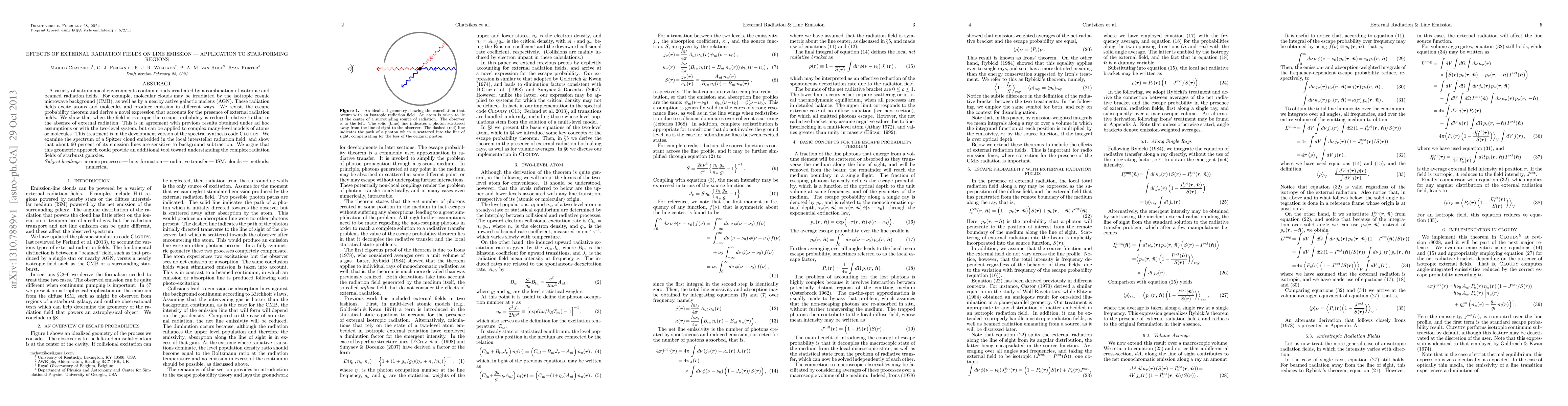 A variety of astronomical environments contain clouds irradiated by a combination of isotropic and beamed radiation fields. For example, molecular clouds may be irradiated by the isotropic cosmic microwave background (CMB), as well as by a nearby active galactic nucleus (AGN). These radiation fields excite atoms and molecules and produce emission in different ways. We revisit the escape probability theorem and derive a novel expression that accounts for the presence of external radiation fields. We show that when the field is isotropic the escape probability is reduced relative to that in the absence of external radiation. This is in agreement with previous results obtained under ad hoc assumptions or with the two-level system, but can be applied to complex many-level models of atoms or molecules. This treatment is in the development version of the spectral synthesis code Cloudy. We examine the spectrum of a Spitzer cloud embedded in the local interstellar radiation field, and show that about 60 percent of its emission lines are sensitive to background subtraction. We argue that this geometric approach could provide an additional tool toward understanding the complex radiation fields of starburst galaxies.