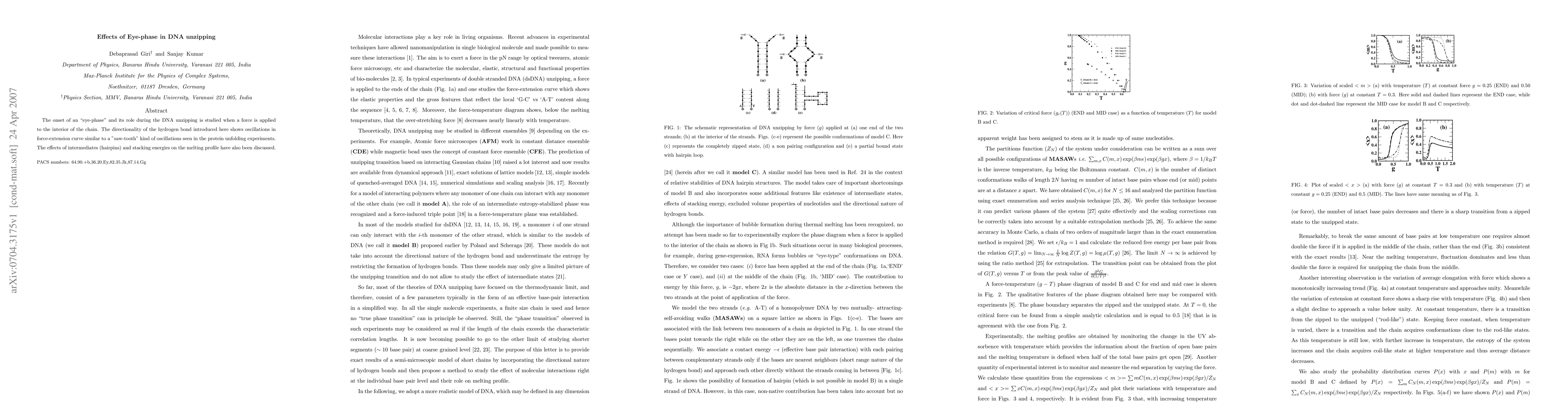 This study investigates the "eye-phase" phenomenon during DNA unzipping under applied force, revealing "saw-tooth" oscillations in the force-extension curve akin to protein unfolding. It also examines the influence of intermediates and stacking energies on the melting profile.