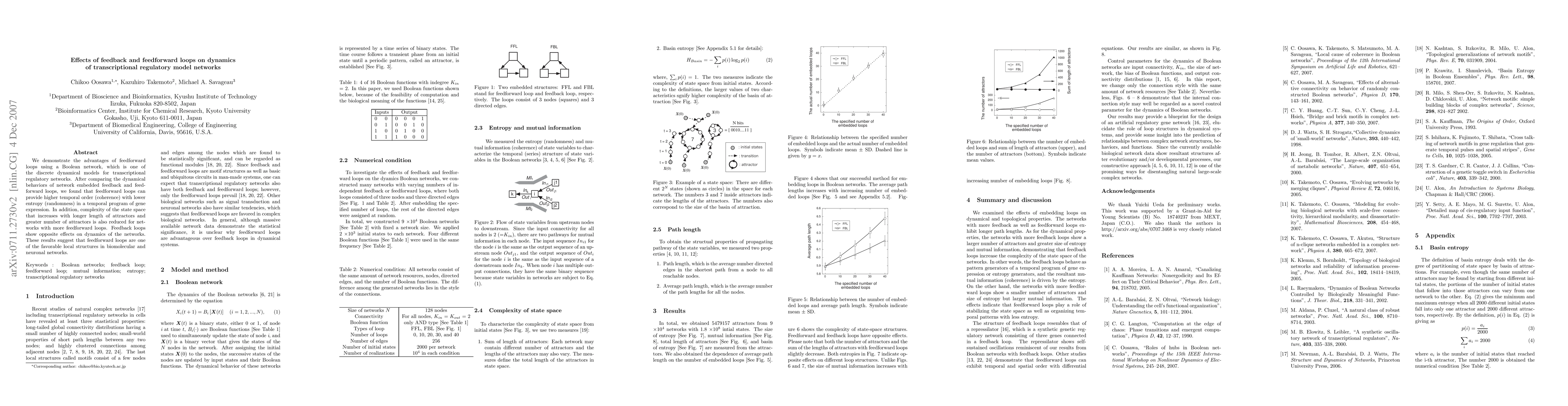 This study shows that feedforward loops in transcriptional regulatory networks lead to higher temporal order and lower entropy in gene expression compared to feedback loops, which have the opposite effect. Networks with more feedforward loops exhibit reduced complexity and longer, more numerous attractors.