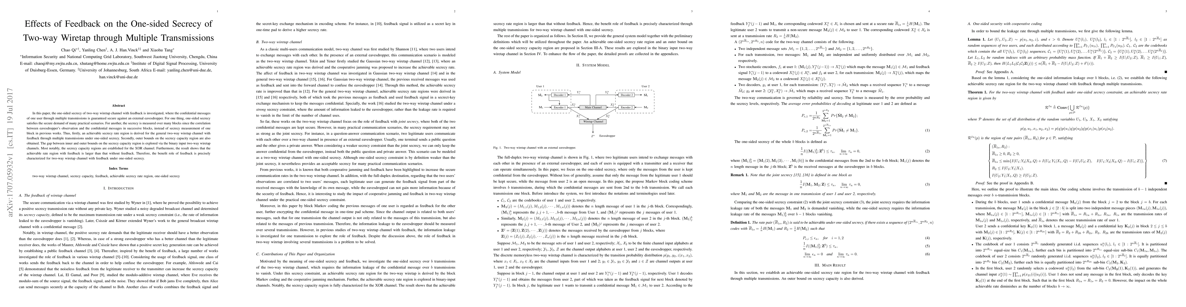In this paper, the one-sided secrecy of two-way wiretap channel with feedback is investigated, where the confidential messages of one user through multiple transmissions is guaranteed secure against an external eavesdropper. For one thing, one-sided secrecy satisfies the secure demand of many practical scenarios. For another, the secrecy is measured over many blocks since the correlation between eavesdropper's observation and the confidential messages in successive blocks, instead of secrecy measurement of one block in previous works. Thus, firstly, an achievable secrecy rate region is derived for the general two-way wiretap channel with feedback through multiple transmissions under one-sided secrecy. Secondly, outer bounds on the secrecy capacity region are also obtained. The gap between inner and outer bounds on the secrecy capacity region is explored via the binary input two-way wiretap channels. Most notably, the secrecy capacity regions are established for the XOR channel. Furthermore, the result shows that the achievable rate region with feedback is larger than that without feedback. Therefore, the benefit role of feedback is precisely characterized for two-way wiretap channel with feedback under one-sided secrecy.