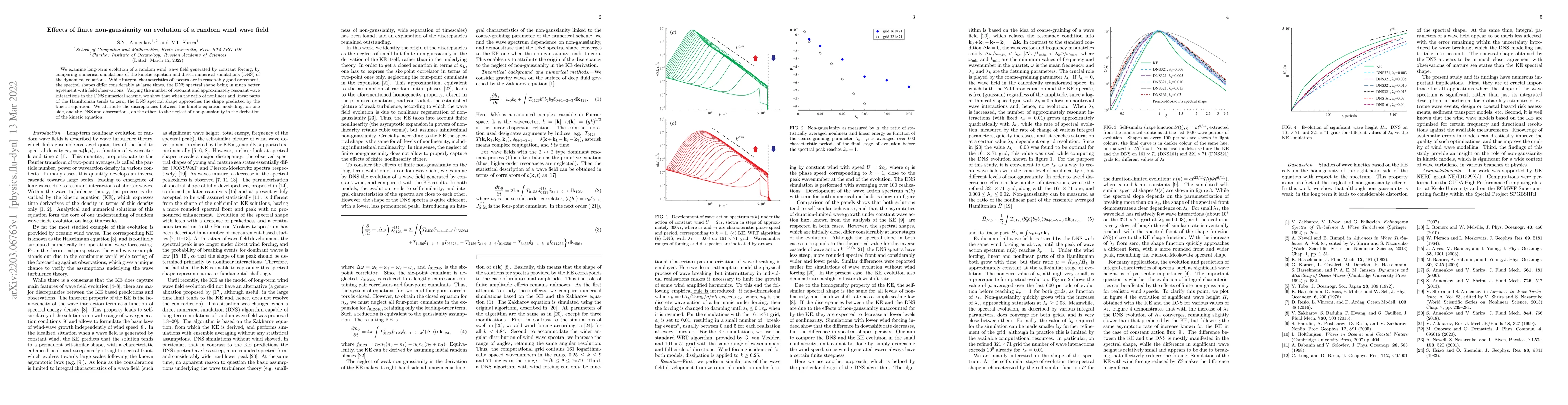 This paper investigates the long-term evolution of a random wind wave field through numerical simulations, revealing significant discrepancies between kinetic equation models and direct numerical simulations (DNS) and observations. The study finds that the DNS spectral shape aligns better with observations, attributing the differences to the kinetic equation's neglect of non-Gaussian effects.
