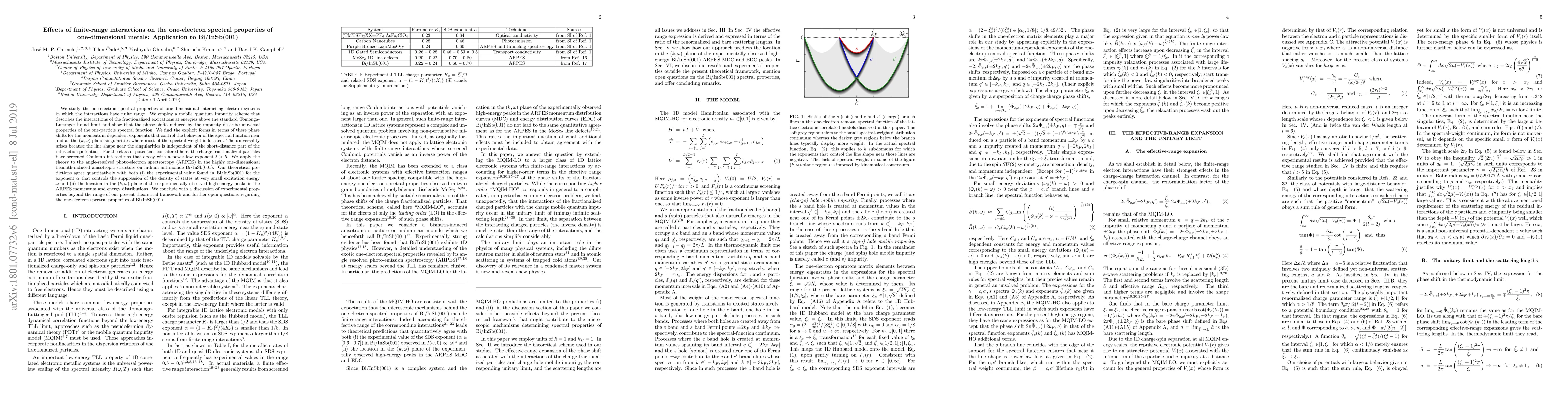 This paper investigates the one-electron spectral properties of one-dimensional metals with finite-range interactions, using a mobile quantum impurity scheme to describe fractionalized excitations. The study reveals universal properties of the one-particle spectral function, independent of short-distance interaction details, and applies the theory to ARPES data in Bi/InSb(001), showing quantitative agreement with experimental observations.