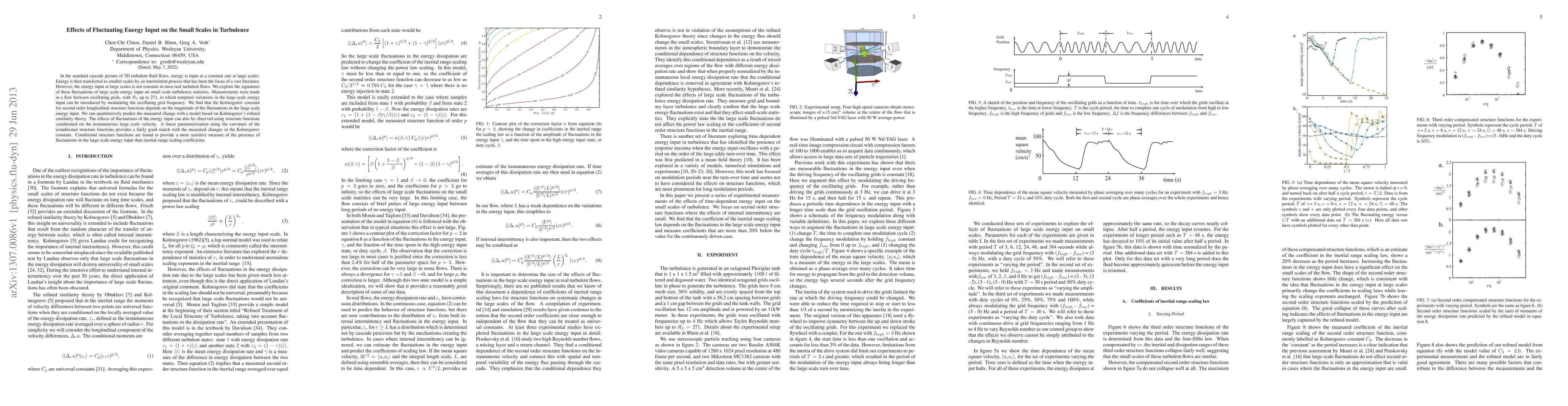 In the standard cascade picture of 3D turbulent fluid flows, energy is input at a constant rate at large scales. Energy is then transferred to smaller scales by an intermittent process that has been the focus of a vast literature. However, the energy input at large scales is not constant in most real turbulent flows. We explore the signatures of these fluctuations of large scale energy input on small scale turbulence statistics. Measurements were made in a flow between oscillating grids, with Re up to 271, in which temporal variations in the large scale energy input can be introduced by modulating the oscillating grid frequency. We find that the Kolmogorov constant for second order longitudinal structure functions depends on the magnitude of the fluctuations in the large scale energy input. We can quantitatively predict the measured change with a model based on Kolmogorov's refined similarity theory. The effects of fluctuations of the energy input can also be observed using structure functions conditioned on the instantaneous large scale velocity. A linear parameterization using the curvature of the iconditional structure functions provides a fairly good match with the measured changes in the Kolmogorov constant. Conditional structure functions are found to provide a more sensitive measure of the presence of fluctuations in the large scale energy input than inertial range scaling coefficients.