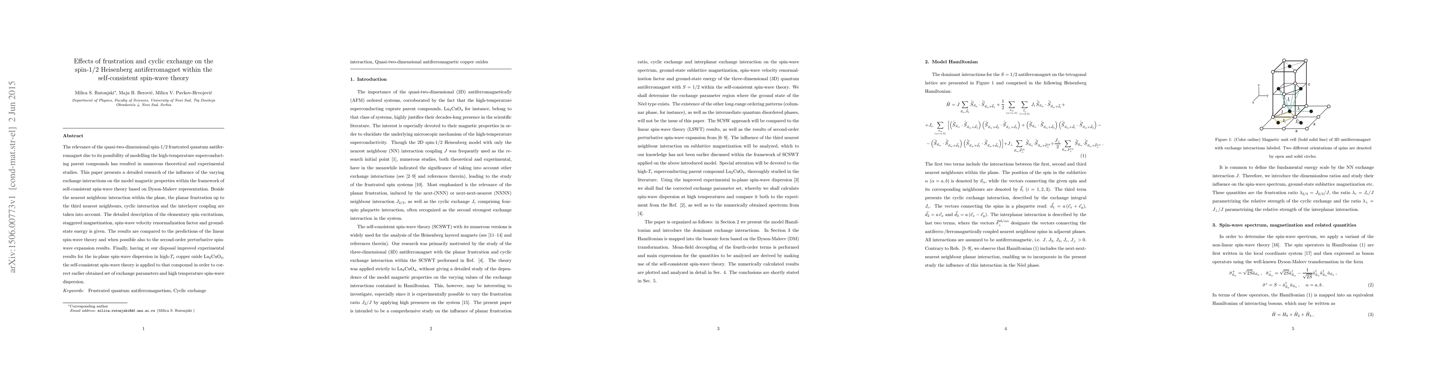 This paper investigates the effects of frustration and cyclic exchange on spin-1/2 Heisenberg antiferromagnets using self-consistent spin-wave theory, focusing on quasi-two-dimensional systems that model high-temperature superconductors. It provides detailed analysis of spin excitations and ground-state energy, comparing results with linear spin-wave theory and applying the model to correct exchange parameters in $\mbox{La}_2\mbox{CuO}_4$.