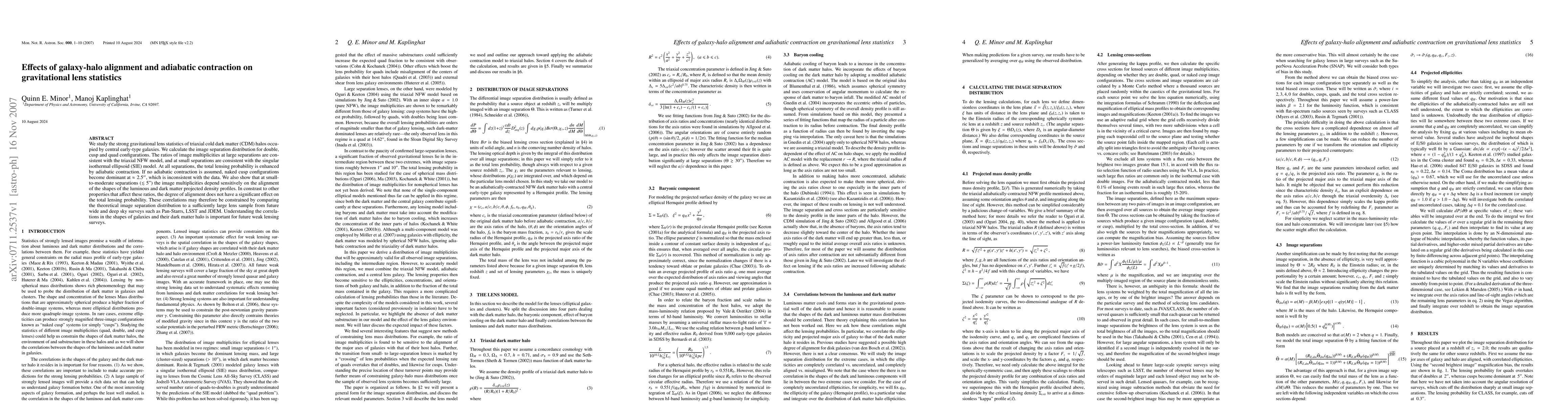 We study the strong gravitational lens statistics of triaxial cold dark matter (CDM) halos occupied by central early-type galaxies. We calculate the image separation distribution for double, cusp and quad configurations. The ratios of image multiplicities at large separations are consistent with the triaxial NFW model, and at small separations are consistent with the singular isothermal ellipsoid (SIE) model. At all separations, the total lensing probability is enhanced by adiabatic contraction. If no adiabatic contraction is assumed, naked cusp configurations become dominant at approximately 2.5'', which is inconsistent with the data. We also show that at small-to-moderate separations, the image multiplicities depend sensitively on the alignment of the shapes of the luminous and dark matter projected density profiles. In constrast to other properties that affect these ratios, the degree of alignment does not have a significant effect on the total lensing probability. These correlations may therefore be constrained by comparing the theoretical image separation distribution to a sufficiently large lens sample from future wide and deep sky surveys such as Pan-Starrs, LSST and JDEM. Understanding the correlations in the shapes of galaxies and their dark matter halo is important for future weak lensing surveys.