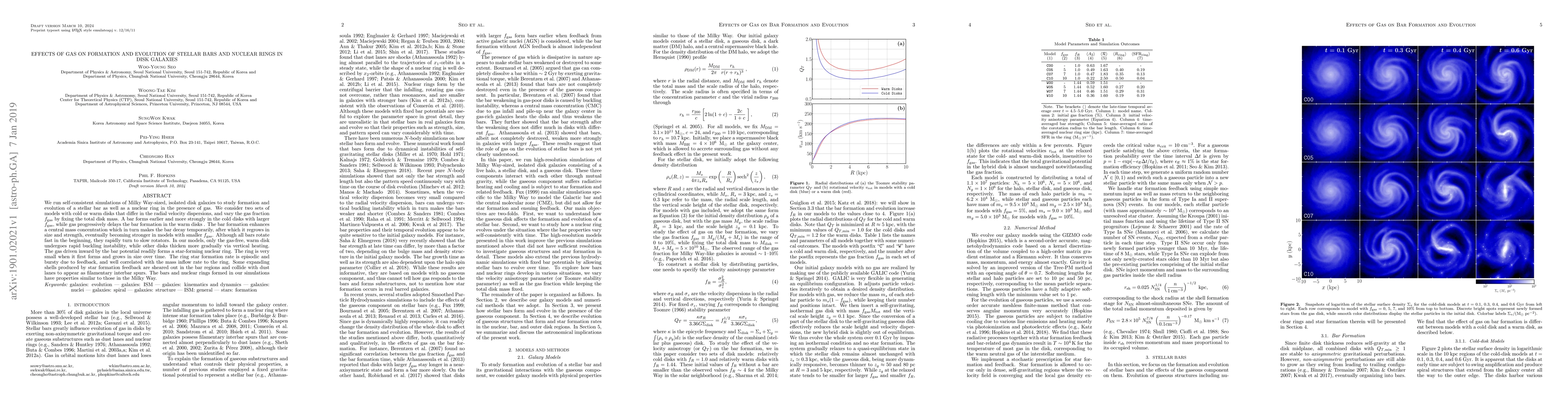 We run self-consistent simulations of Milky Way-sized, isolated disk galaxies to study formation and evolution of a stellar bar as well as a nuclear ring in the presence of gas. We consider two sets of models with cold or warm disks that differ in the radial velocity dispersions, and vary the gas fraction $f_{\rm gas}$ by fixing the total disk mass. A bar forms earlier and more strongly in the cold disks with larger $f_{\rm gas}$, while gas progressively delays the bar formation in the warm disks . The bar formation enhances a central mass concentration which in turn makes the bar decay temporarily, after which it regrows in size and strength, eventually becoming stronger in models with smaller $f_{\rm gas}$. Although all bars rotate fast in the beginning, they rapidly turn to slow rotators. In our models, only the gas-free, warm disk undergoes rapid buckling instability, while other disks thicken more gradually via vertical heating. The gas driven inward by the bar potential readily forms a star-forming nuclear ring. The ring is very small when it first forms and grows in size over time. The ring star formation rate is episodic and bursty due to feedback, and well correlated with the mass inflow rate to the ring. Some expanding shells produced by star formation feedback are sheared out in the bar regions and collide with dust lanes to appear as filamentary interbar spurs. The bars and nuclear rings formed in our simulations have properties similar to those in the Milky Way.