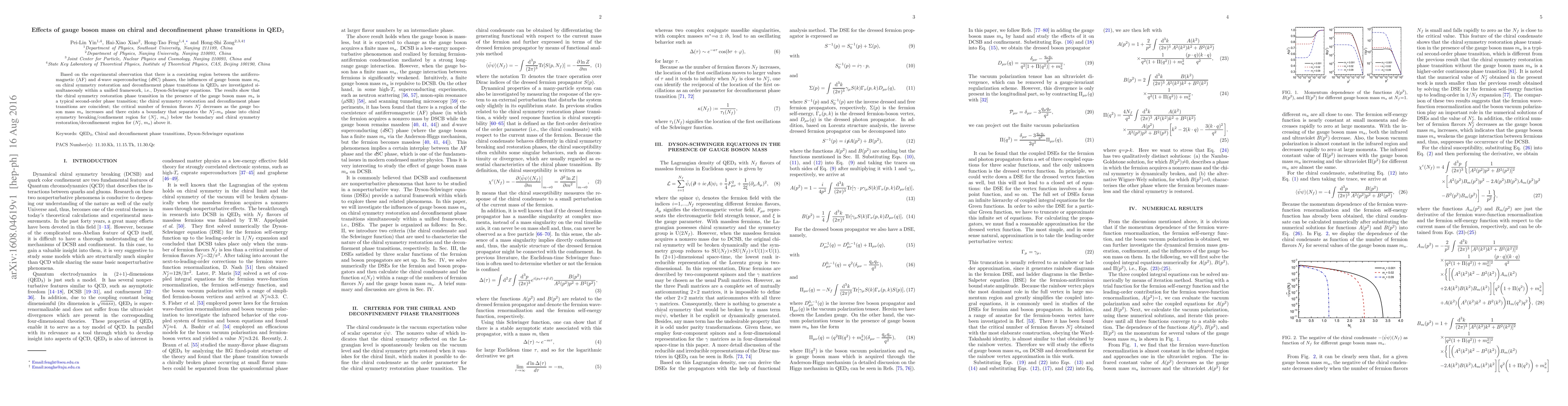 Based on the experimental observation that there is a coexisting region between the antiferromagnetic (AF) and $\textit{d}$-wave superconducting ($\textit{d}$SC) phases, the influences of gauge boson mass $m_{a}$ on chiral symmetry restoration and deconfinement phase transitions in QED$_{3}$ are investigated simultaneously within a unified framework, i.e., Dyson-Schwinger equations. The results show that the chiral symmetry restoration phase transition in the presence of the gauge boson mass $m_{a}$ is a typical second-order phase transition; the chiral symmetry restoration and deconfinement phase transitions are coincident; the critical number of fermion flavors $N^{c}_{f}$ decreases as the gauge boson mass $m_{a}$ increases and there exists a boundary that separates the $N^{c}_{f}$-$m_{a}$ plane into chiral symmetry breaking/confinement region for ($N_{f}^{c}$, $m_{a}$) below the boundary and chiral symmetry restoration/deconfinement region for ($N_{f}^{c}$, $m_{a}$) above it.