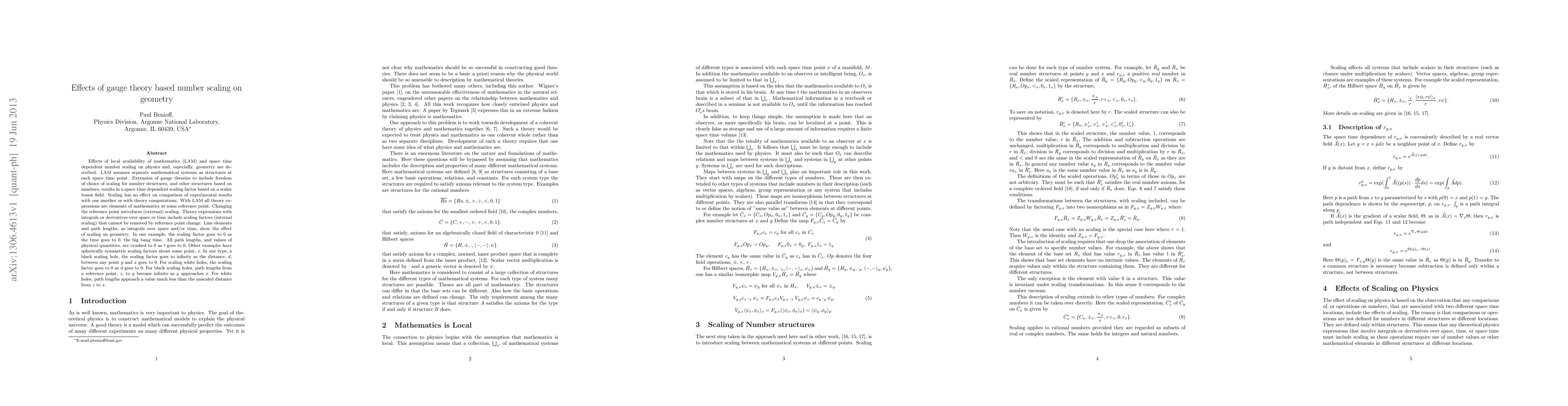 Effects of local availability of mathematics (LAM) and space time dependent number scaling on physics and, especially, geometry are described. LAM assumes separate mathematical systems as structures at each space time point. Extension of gauge theories to include freedom of choice of scaling for number structures, and other structures based on numbers, results in a space time dependent scaling factor based on a scalar boson field. Scaling has no effect on comparison of experimental results with one another or with theory computations. With LAM all theory expressions are elements of mathematics at some reference point. Changing the reference point introduces (external) scaling. Theory expressions with integrals or derivatives over space or time include scaling factors (internal scaling) that cannot be removed by reference point change. Line elements and path lengths, as integrals over space and/or time, show the effect of scaling on geometry. In one example, the scaling factor goes to 0 as the time goes to 0, the big bang time. All path lengths, and values of physical quantities, are crushed to 0 as $t$ goes to 0. Other examples have spherically symmetric scaling factors about some point, $x.$ In one type, a black scaling hole, the scaling factor goes to infinity as the distance, $d$, between any point $y$ and $x$ goes to 0. For scaling white holes, the scaling factor goes to 0 as $d$ goes to 0. For black scaling holes, path lengths from a reference point, $z$, to $y$ become infinite as $y$ approaches $x.$ For white holes, path lengths approach a value much less than the unscaled distance from $z$ to $x.$