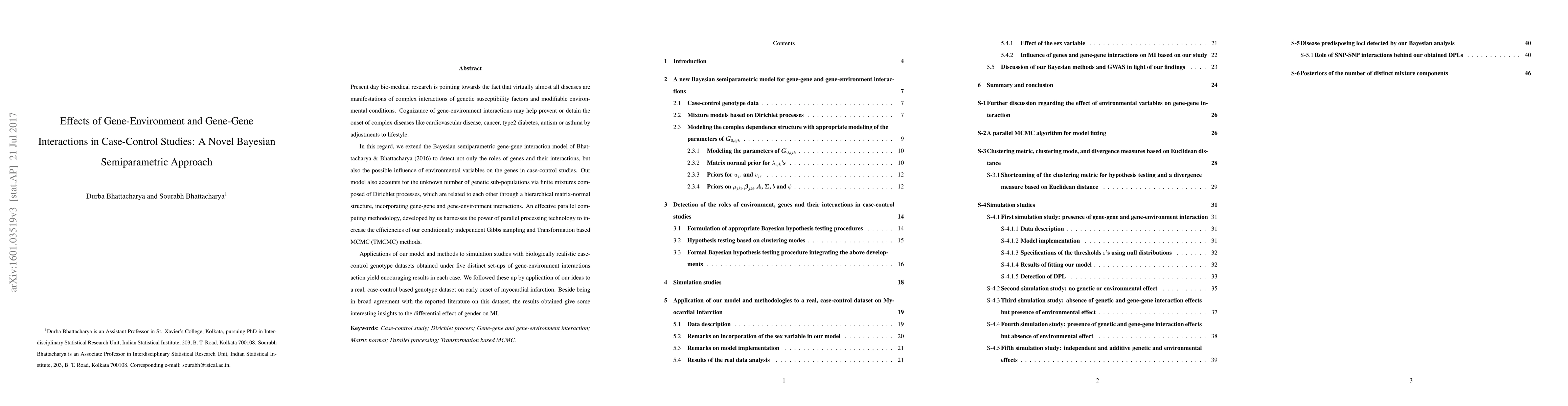 Cognizance of gene-environment interactions may help prevent or detain the onset of complex diseases like cardiovascular disease, cancer, type2 diabetes, autism or asthma by adjustments to lifestyle. In this regard, we extend the Bayesian semiparametric gene-gene interaction model of Bhattacharya & Bhattacharya (2015) to include the possibility of influencing gene-gene interactions by environmental variables and possible mutations caused by the environment. Our model accounts for the unknown number of genetic sub-populations via finite mixtures composed of Dirichlet processes, which are related to each other through a hierarchical matrix normal structure responsible for inducing gene-gene interactions and possible mutations in association with environmental variables. We also extend the Bayesian hypotheses testing procedures of Bhattacharya & Bhattacharya (2015) to detect the roles of genes and their interactions, environment and the influence of environment on gene-gene interactions, in case-control studies. We develop an effective parallel computing methodology, which harnesses the power of parallel processing technology to the efficiencies of our conditionally independent Gibbs sampling and Transformation based MCMC (TMCMC) methods.Applications of our model and methods to simulation studies with biologically realistic case-control genotype datasets obtained under five distinct set-ups yield encouraging results in each case. We followed these up by application of our ideas to a real, case-control based genotype dataset on early onset of myocardial infarction. Beside being in broad agreement with the reported literature on this dataset, the results obtained give some interesting insights to the differential effect of gender on MI.