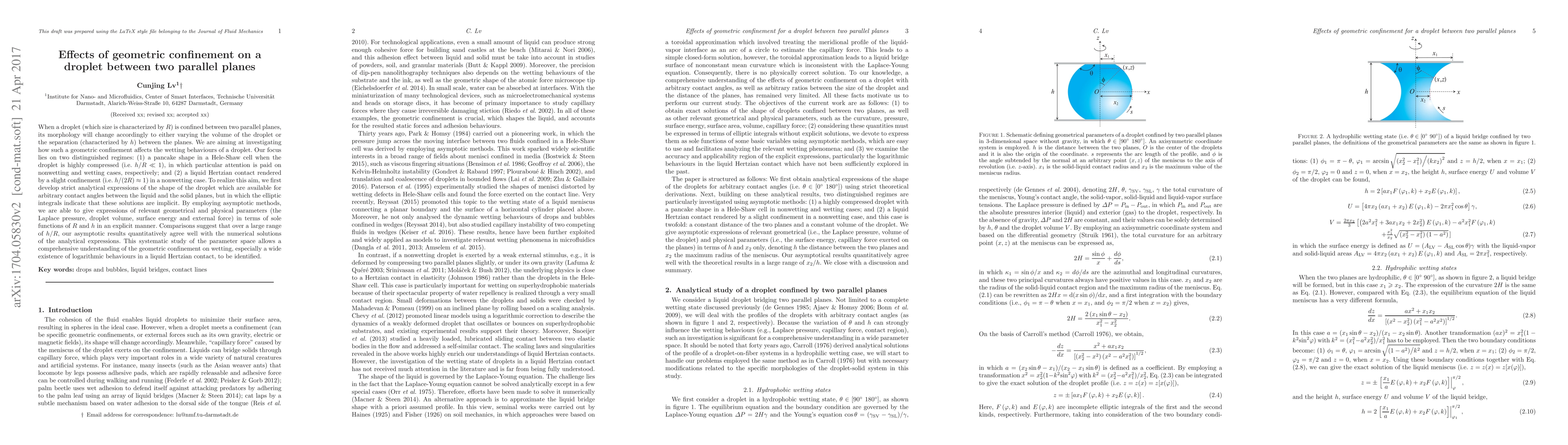 A study investigates how a droplet's shape changes when confined between two parallel planes, affecting its wetting behavior. The research finds logarithmic behaviors in liquid Hertzian contact under geometric confinement.