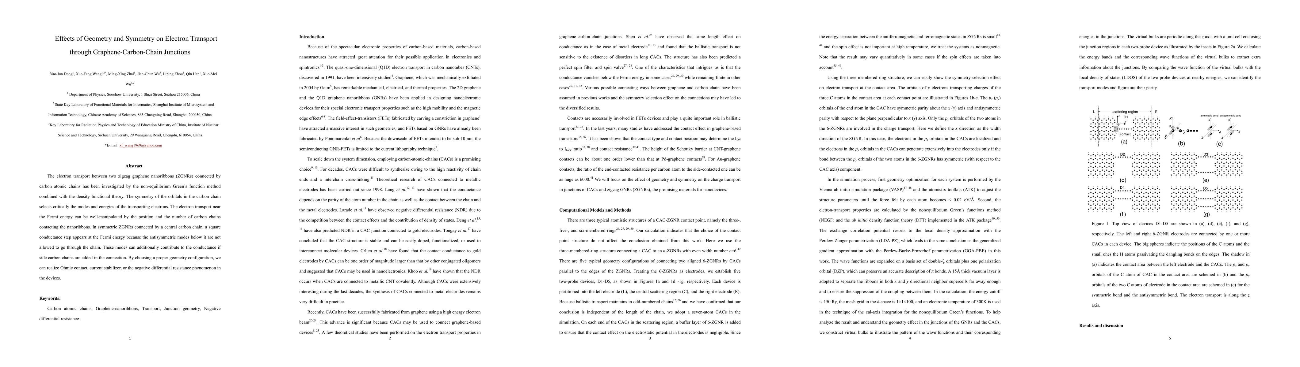 This study investigates electron transport through junctions of zigzag graphene nanoribbons connected by carbon atomic chains using nonequilibrium Green's function and density functional theory. The symmetry of carbon chain orbitals critically influences electron transport modes and energies, allowing manipulation of conductance near the Fermi energy by adjusting the geometry and number of carbon chains.