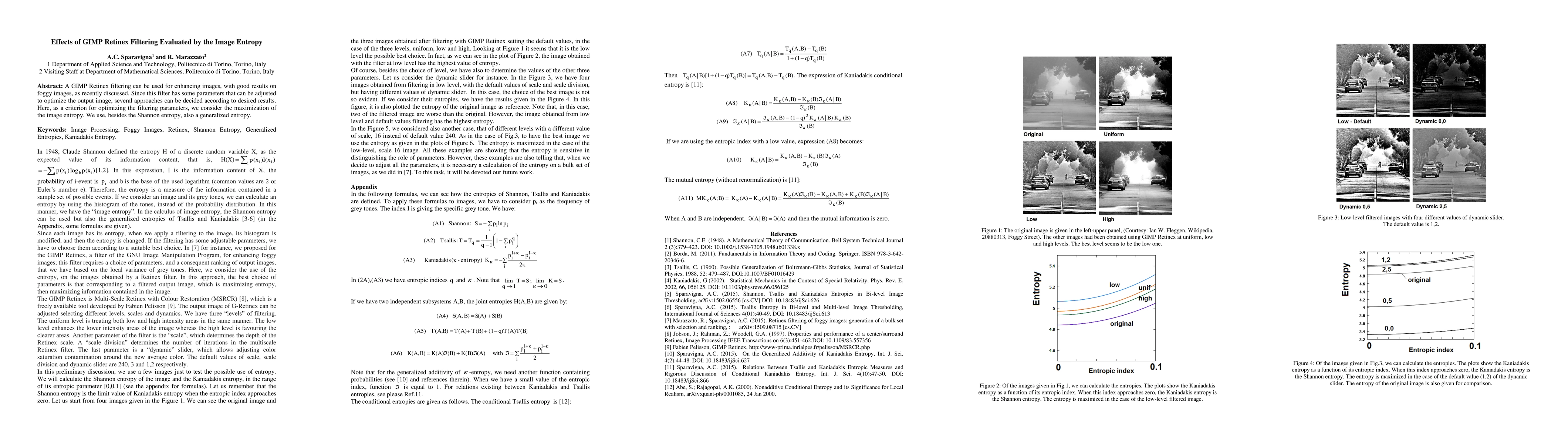 A GIMP Retinex filtering can be used for enhancing images, with good results on foggy images, as recently discussed. Since this filter has some parameters that can be adjusted to optimize the output image, several approaches can be decided according to desired results. Here, as a criterion for optimizing the filtering parameters, we consider the maximization of the image entropy. We use, besides the Shannon entropy, also a generalized entropy.