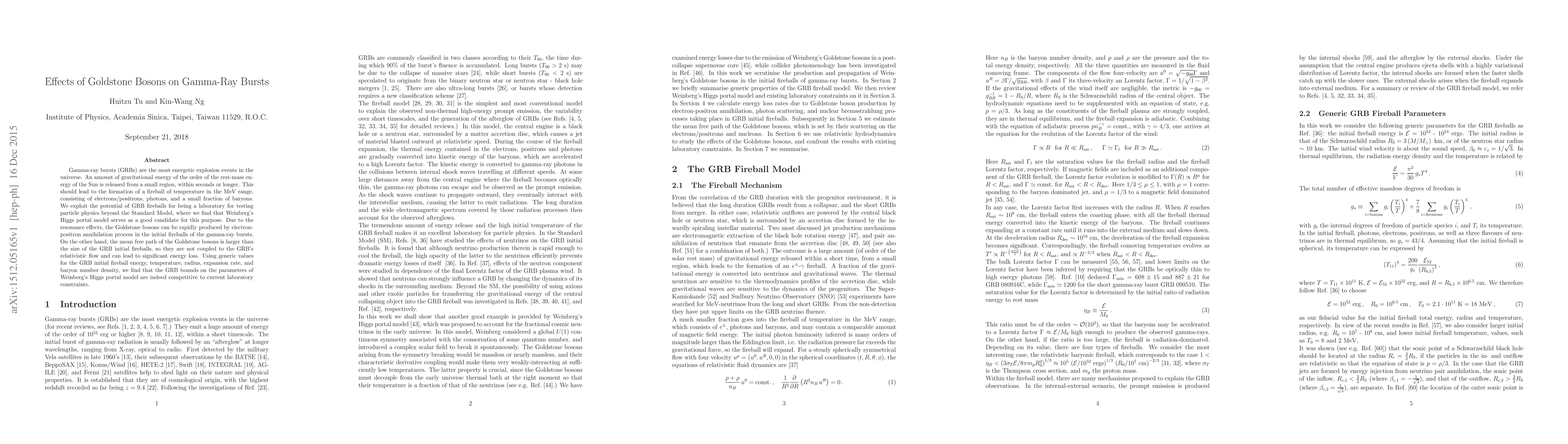 Gamma-ray bursts (GRBs) are the most energetic explosion events in the universe. An amount of gravitational energy of the order of the rest-mass energy of the Sun is released from a small region, within seconds or longer. This should lead to the formation of a fireball of temperature in the MeV range, consisting of electrons/positrons, photons, and a small fraction of baryons. We exploit the potential of GRB fireballs for being a laboratory for testing particle physics beyond the Standard Model, where we find that Weinberg's Higgs portal model serves as a good candidate for this purpose. Due to the resonance effects, the Goldstone bosons can be rapidly produced by electron-positron annihilation process in the initial fireballs of the gamma-ray bursts. On the other hand, the mean free path of the Goldstone bosons is larger than the size of the GRB initial fireballs, so they are not coupled to the GRB's relativistic flow and can lead to significant energy loss. Using generic values for the GRB initial fireball energy, temperature, radius, expansion rate, and baryon number density, we find that the GRB bounds on the parameters of Weinberg's Higgs portal model are indeed competitive to current laboratory constraints.