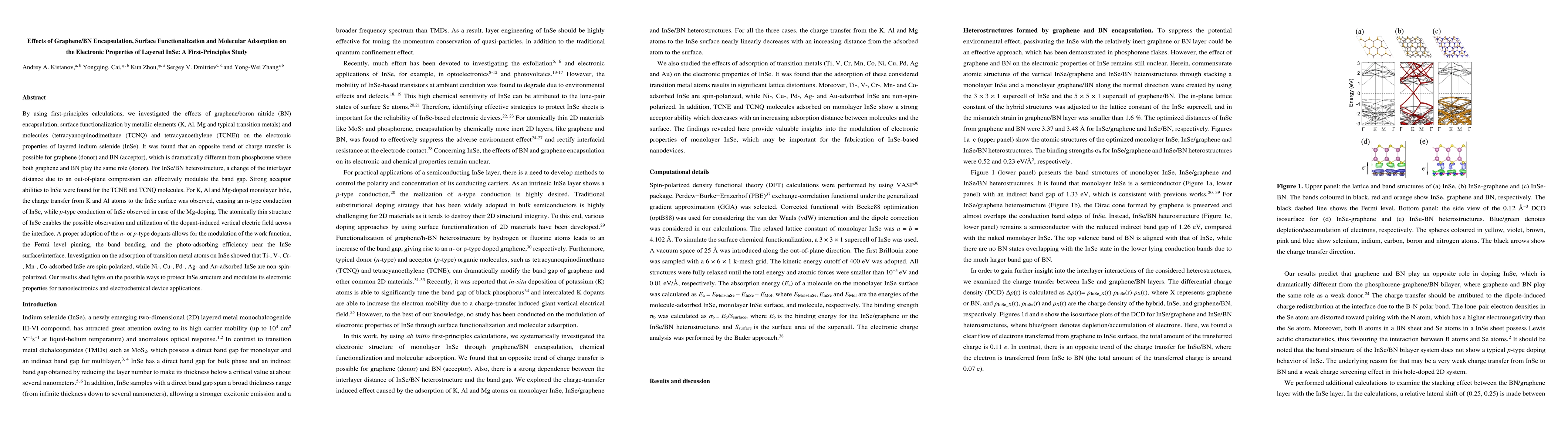 This study uses first-principles calculations to explore how graphene/BN encapsulation, surface functionalization, and molecular adsorption affect the electronic properties of layered InSe. Results show distinct charge transfer behaviors between graphene and BN, with TCNE and TCNQ acting as strong acceptors, and K, Al, Mg doping inducing n-type or p-type conduction in InSe, highlighting potential for nanoelectronics and electrochemical applications.