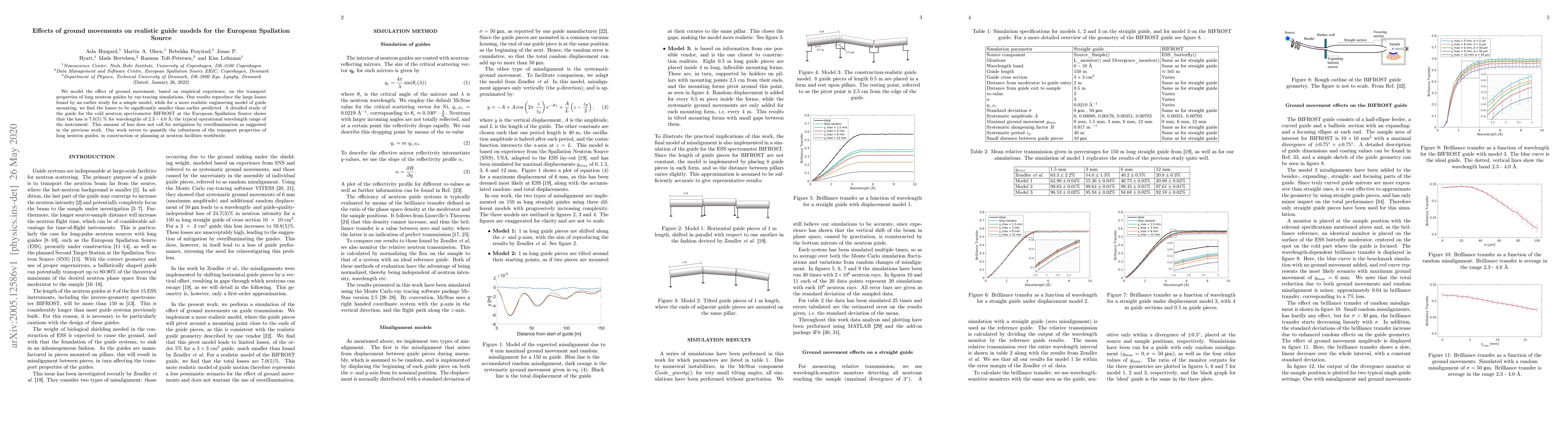 The research models the effect of ground movement on neutron guide transport properties using ray-tracing simulations, comparing three models of guide misalignment.