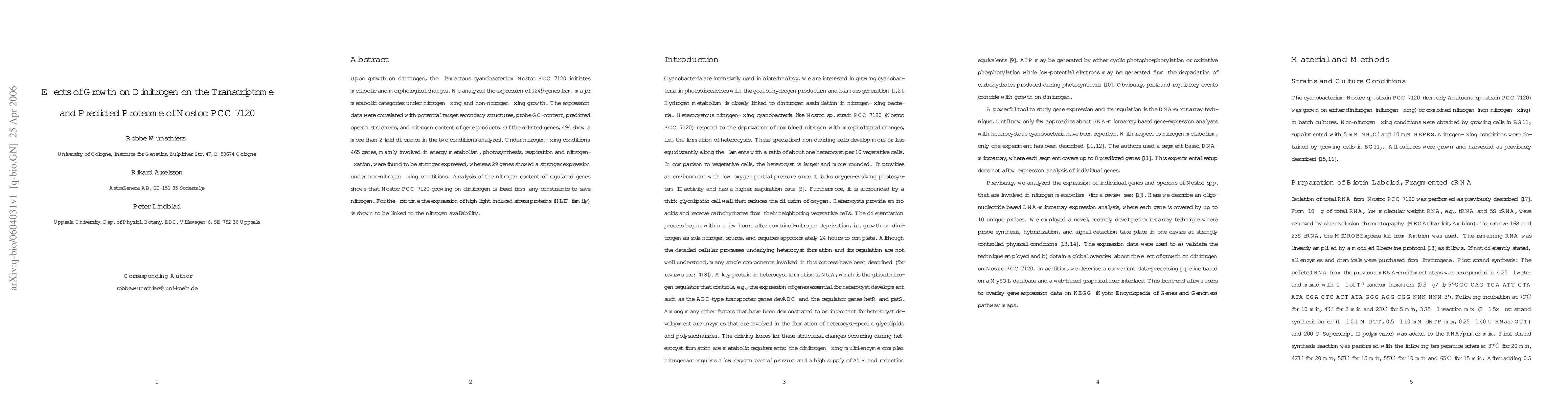 Nostoc PCC 7120 cyanobacterium changes its gene expression when growing on dinitrogen, with key genes involved in energy metabolism, photosynthesis, and nitrogen fixation showing increased expression.