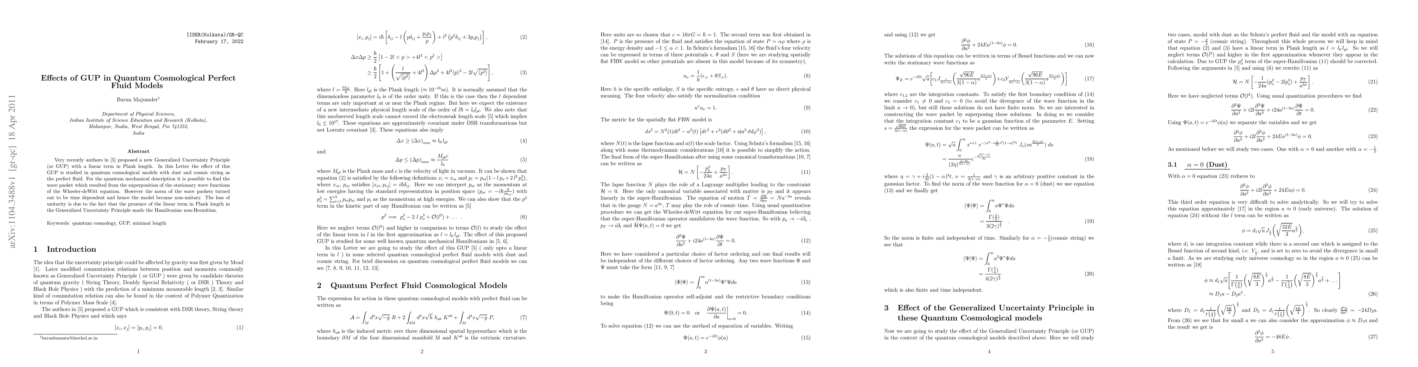 The research investigates quantum cosmological models with dust and cosmic strings as perfect fluids, applying a recently proposed Generalized Uncertainty Principle (GUP) with a linear term in Planck length. It derives stationary wave functions from the Wheeler-deWitt equation and constructs wave packets by superposing these solutions.