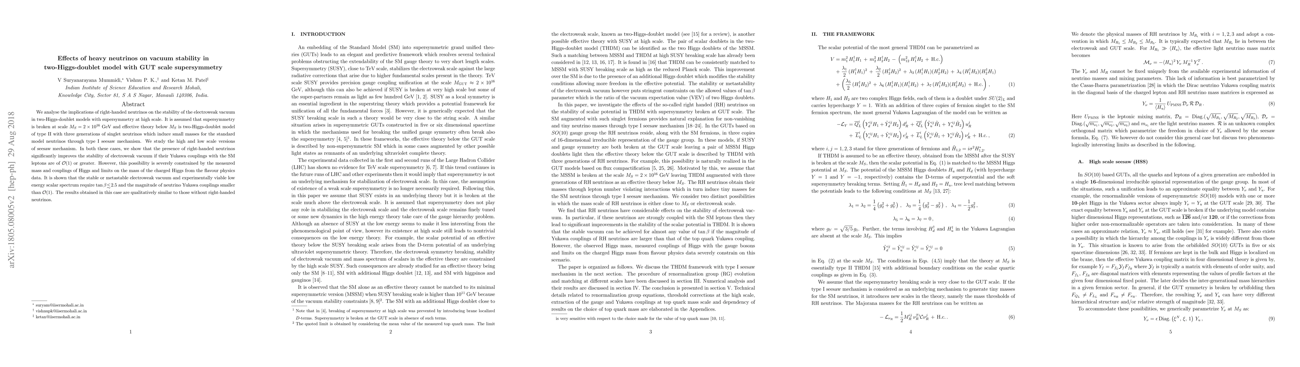This paper investigates how heavy right-handed neutrinos affect the stability of the electroweak vacuum in a supersymmetric two-Higgs-doublet model at the GUT scale. It finds that right-handed neutrinos significantly enhance vacuum stability if their Yukawa couplings are ${\cal O}(1)$ or larger, but such scenarios are constrained by experimental data.
