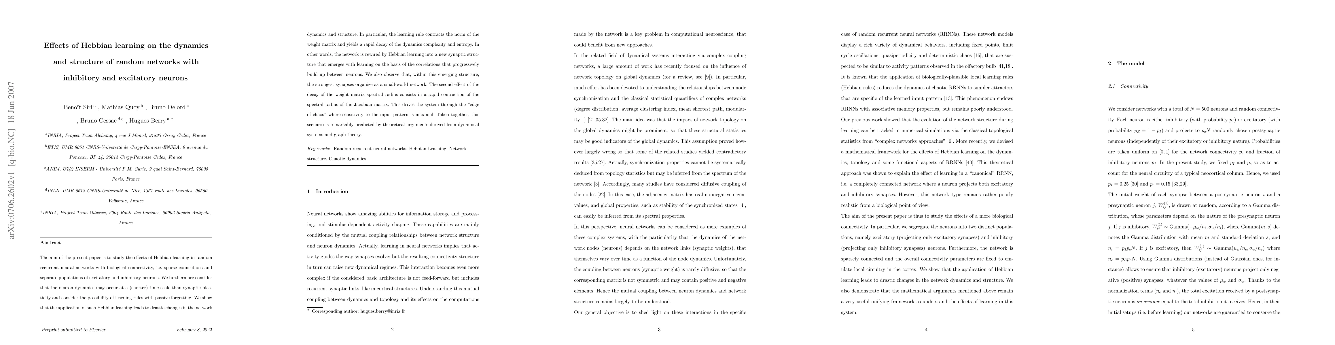 This paper investigates the impact of Hebbian learning on random recurrent neural networks with distinct excitatory and inhibitory neurons, revealing that it significantly alters network dynamics and structure. The learning process reduces the weight matrix norm, leading to a decrease in network complexity and entropy, and reorganizes the strongest synapses into a small-world network, driving the system to the "edge of chaos" for maximal sensitivity to input patterns.