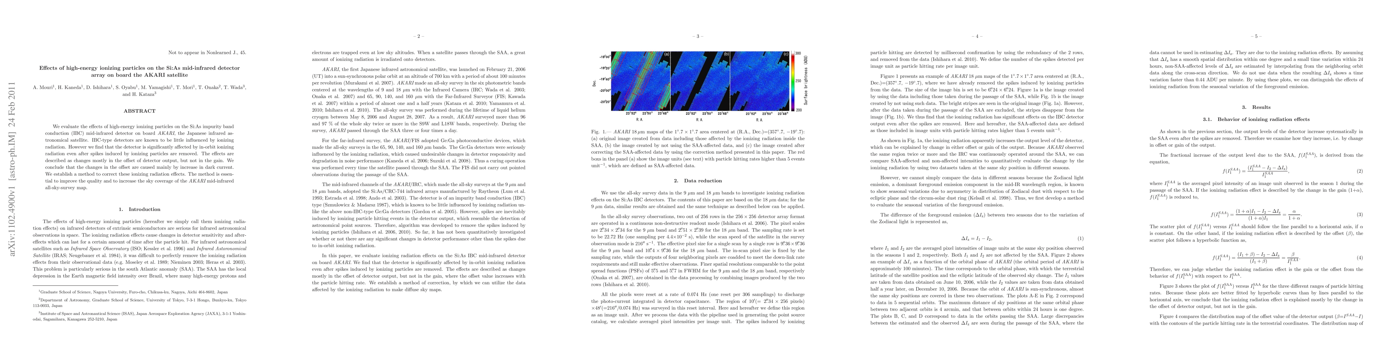 We evaluate the effects of high-energy ionizing particles on the Si:As impurity band conduction (IBC) mid-infrared detector on board AKARI, the Japanese infrared astronomical satellite. IBC-type detectors are known to be little influenced by ionizing radiation. However we find that the detector is significantly affected by in-orbit ionizing radiation even after spikes induced by ionizing particles are removed. The effects are described as changes mostly in the offset of detector output, but not in the gain. We conclude that the changes in the offset are caused mainly by increase in dark current. We establish a method to correct these ionizing radiation effects. The method is essential to improve the quality and to increase the sky coverage of the AKARI mid-infrared all-sky-survey map.