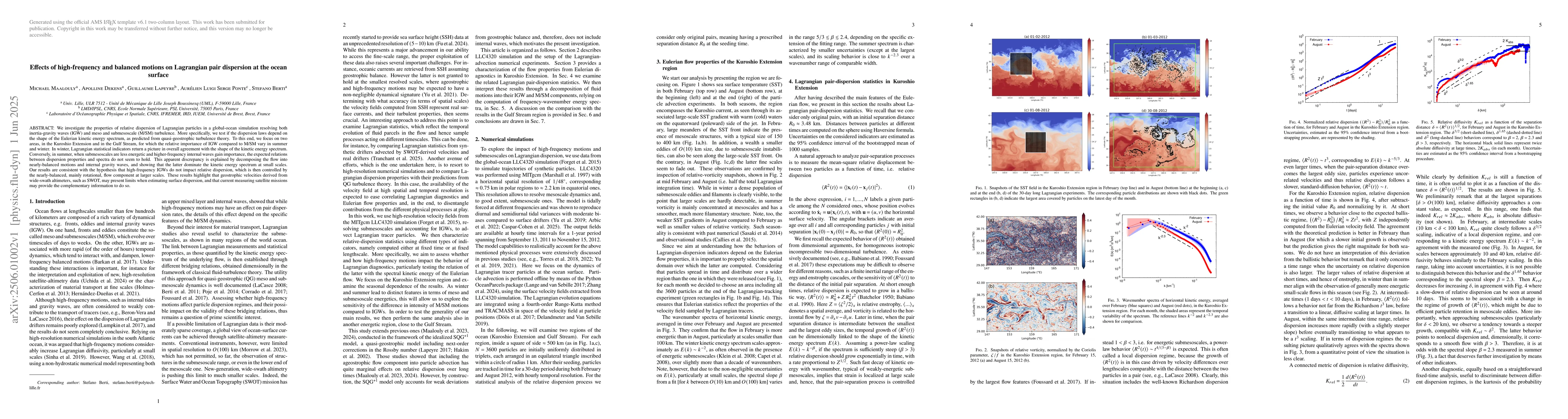 Researchers studied ocean surface dispersion in two areas with varying importance of inertia-gravity waves and meso/submesoscale turbulence, finding that high-frequency IGWs do not impact relative dispersion, which is controlled by larger-scale rotational flow.