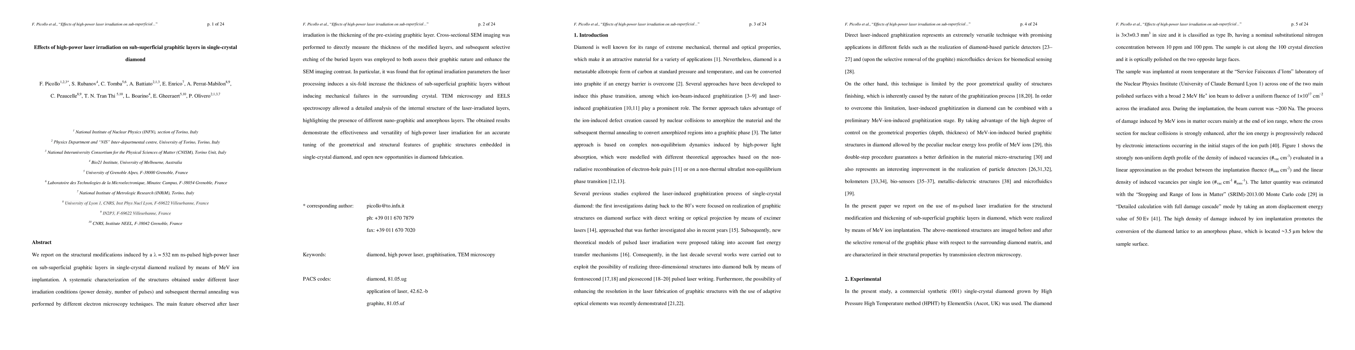 This study investigates the structural changes in sub-superficial graphitic layers within single crystal diamond induced by high-power laser irradiation at 532 nm. The research reveals that optimal laser parameters can thicken these layers six-fold without damaging the surrounding crystal, showcasing the potential for precise diamond fabrication.