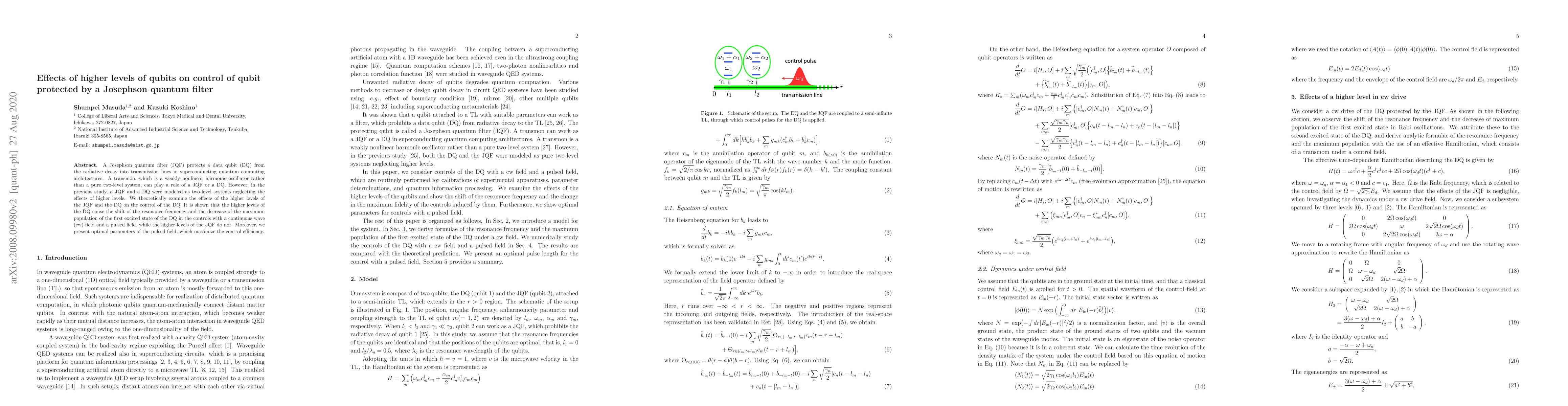 A Josephson quantum filter (JQF) protects a data qubit (DQ) from the radiative decay into transmission lines in superconducting quantum computing architectures. A transmon, which is a weakly nonlinear harmonic oscillator rather than a pure two-level system, can play a role of a JQF or a DQ. However, in the previous study, a JQF and a DQ were modeled as two-level systems neglecting the effects of higher levels. We theoretically examine the effects of the higher levels of the JQF and the DQ on the control of the DQ. It is shown that the higher levels of the DQ cause the shift of the resonance frequency and the decrease of the maximum population of the first excited state of the DQ in the controls with a continuous wave (cw) field and a pulsed field, while the higher levels of the JQF do not. Moreover, we present optimal parameters of the pulsed field, which maximize the control efficiency.