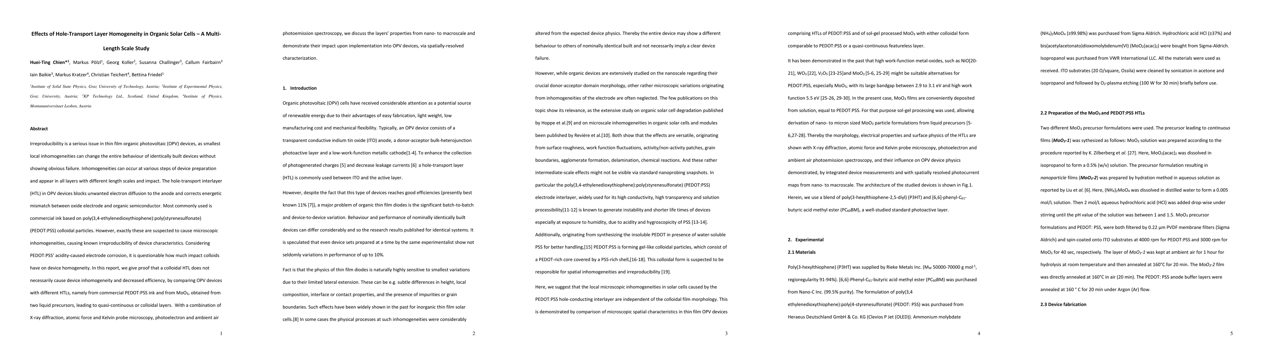 Irreproducibility is a serious issue in thin film organic photovoltaic (OPV) devices, as smallest local inhomogeneities can change the entire behaviour of identically built devices without showing obvious failure. Inhomogeneities can occur at various steps of device preparation and appear in all layers with different length scales and impact. The hole-transport interlayer (HTL) in OPV devices blocks unwanted electron diffusion to the anode and corrects energetic mismatch between oxide electrode and organic semiconductor. Most commonly used is commercial ink based on poly(3,4-ethylenedioxythiophene) poly(styrenesulfonate) (PEDOT PSS) colloidal particles. However, exactly these are suspected to cause microscopic inhomogeneities, causing known irreproducibility of device characteristics. Considering PEDOT:PSS acidity-caused electrode corrosion, it is questionable how much impact colloids have on device homogeneity. In this report, we give proof that a colloidal HTL does not necessarily cause device inhomogeneity and decreased efficiency, by comparing OPV devices with different HTLs, namely from commercial PEDOT:PSS ink and from MoO3, obtained from two liquid precursors, leading to quasi-continuous or colloidal layers. With a combination of X-ray diffraction, atomic force and Kelvin probe microscopy, photoelectron and ambient air photoemission spectroscopy, we discuss the layers properties from nano- to macroscale and demonstrate their impact upon implementation into OPV devices, via spatially-resolved characterization.