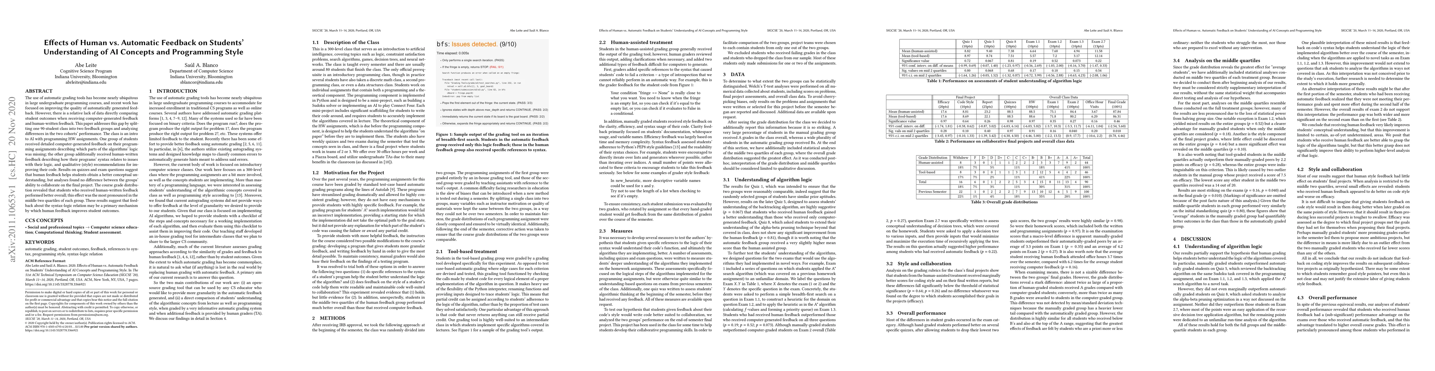 This study compares student outcomes in an intro to AI course when receiving computer-generated vs. human-written feedback on programming assignments, finding that human feedback significantly improves conceptual understanding and overall performance, particularly among middle-performing students. No significant difference in collaboration skills was observed between the groups.