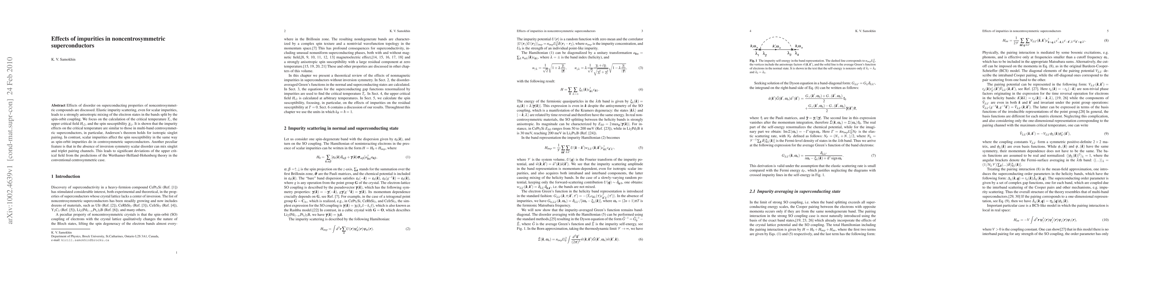 This study investigates how impurities influence the superconducting properties of noncentrosymmetric compounds, finding that impurity scattering leads to anisotropic mixing of electron states due to spin-orbit coupling. It concludes that while the critical temperature effects resemble those in centrosymmetric superconductors, scalar impurities uniquely impact spin susceptibility and can mix singlet and triplet pairing channels, causing significant deviations in the upper critical field.
