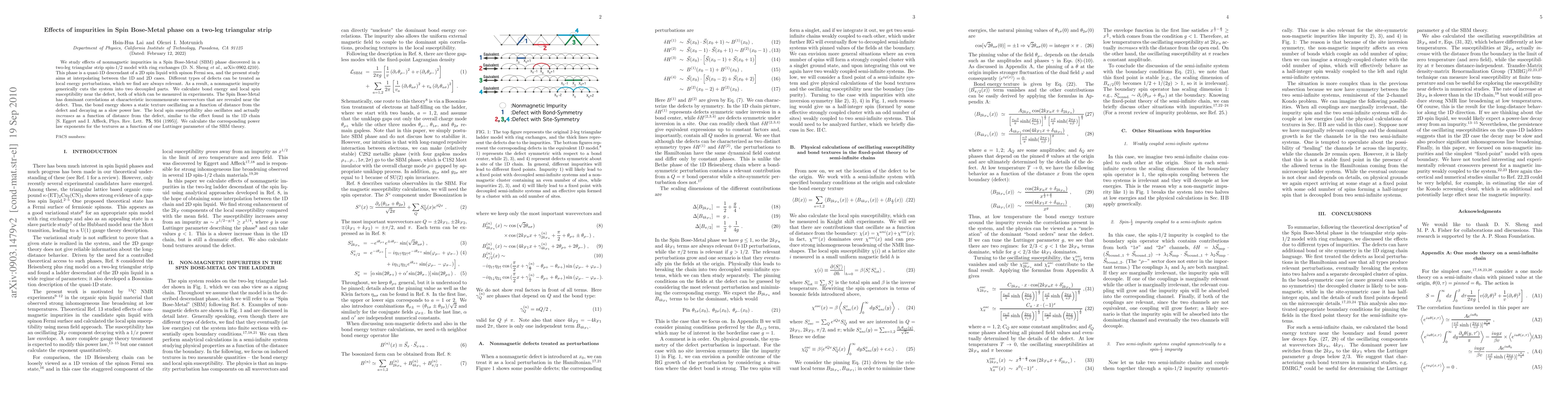 We study effects of nonmagnetic impurities in a Spin Bose-Metal (SBM) phase discovered in a two-leg triangular strip spin-1/2 model with ring exchanges (D. N. Shenget al, arXiv:0902.4210). This phase is a quasi-1D descendant of a 2D spin liquid with spinon Fermi sea, and the present study aims at interpolating between the 1D and 2D cases. Different types of defects can be treated as local energy perturbations, which we find are always relevant. As a result, a nonmagnetic impurity generically cuts the system into two decoupled parts. We calculate bond energy and local spin susceptibility near the defect, both of which can be measured in experiments. The Spin Bose-Metal has dominant correlations at characteristic incommensurate wavevectors that are revealed near the defect. Thus, the bond energy shows a static texture oscillating as a function of distance from the defect and decaying as a slow power law. The local spin susceptibility also oscillates and actually {\it increases} as a function of distance from the defect, similar to the effect found in the 1D chain [S. Eggert and I. Affleck, Phys. Rev. Lett. {\bf 75}, 934 (1995)]. We calculate the corresponding power law exponents for the textures as a function of one Luttinger parameter of the SBM theory.