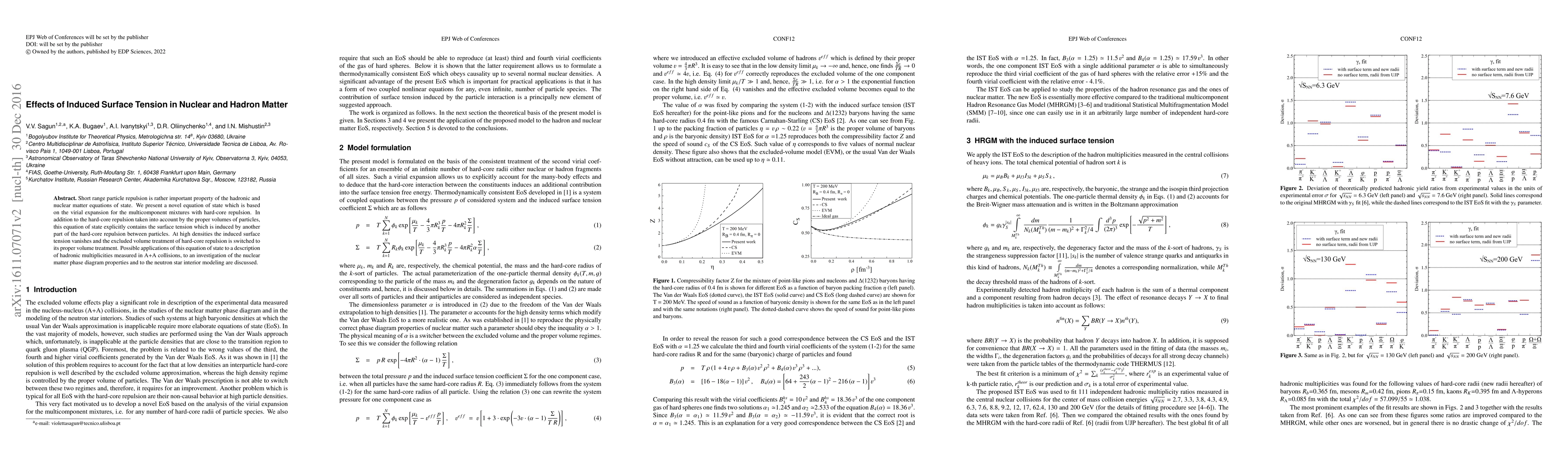 Short range particle repulsion is rather important property of the hadronic and nuclear matter equations of state. We present a novel equation of state which is based on the virial expansion for the multicomponent mixtures with hard-core repulsion. In addition to the hard-core repulsion taken into account by the proper volumes of particles, this equation of state explicitly contains the surface tension which is induced by another part of the hard-core repulsion between particles. At high densities the induced surface tension vanishes and the excluded volume treatment of hard-core repulsion is switched to its proper volume treatment. Possible applications of this equation of state to a description of hadronic multiplicities measured in A+A collisions, to an investigation of the nuclear matter phase diagram properties and to the neutron star interior modeling are discussed.