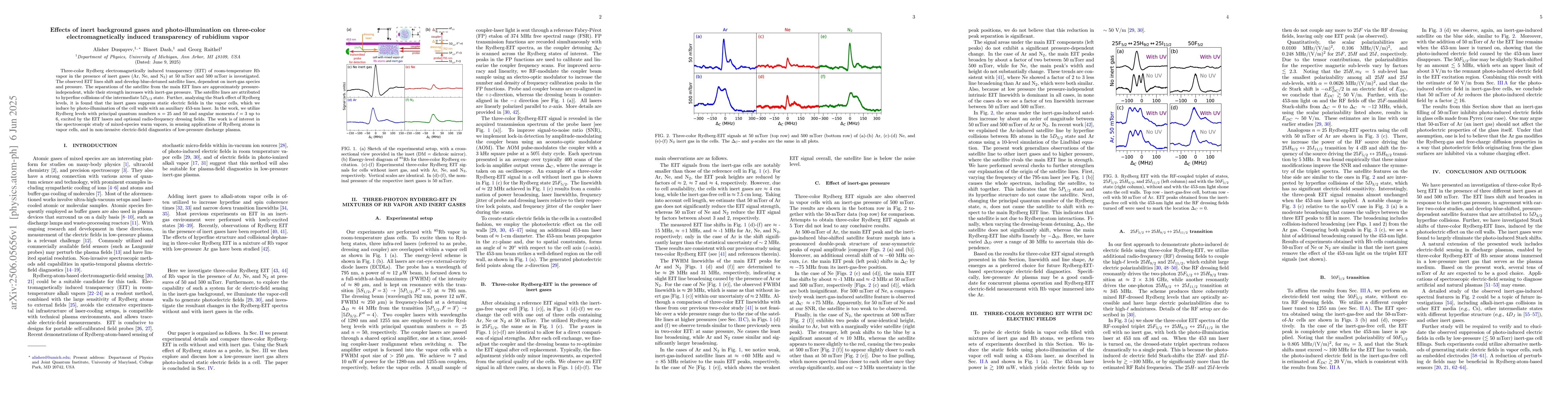 Three-color Rydberg electromagnetically induced transparency (EIT) of room-temperature Rb vapor in the presence of inert gases (Ar, Ne, and N$_2$) at 50~mTorr and 500~mTorr is investigated. The observed EIT lines shift and develop blue-detuned satellite lines, dependent on inert-gas species and pressure. The separations of the satellite from the main EIT lines are approximately pressure-independent, while their strength increases with inert-gas pressure. The satellite lines are attributed to hyperfine collisions of the intermediate $5D_{3/2}$ state. Further, analyzing the Stark effect of Rydberg levels, it is found that the inert gases suppress static electric fields in the vapor cells, which we induce by photo-illumination of the cell walls with an auxiliary 453-nm laser. In the work, we utilize Rydberg levels with principal quantum numbers $n$ = 25 and 50 and angular momenta $\ell$ = 3 up to 6, excited by the EIT lasers and optional radio-frequency dressing fields. The work is of interest in the spectroscopic study of mixed-species warm vapors, in sensing applications of Rydberg atoms in vapor cells, and in non-invasive electric-field diagnostics of low-pressure discharge plasma.