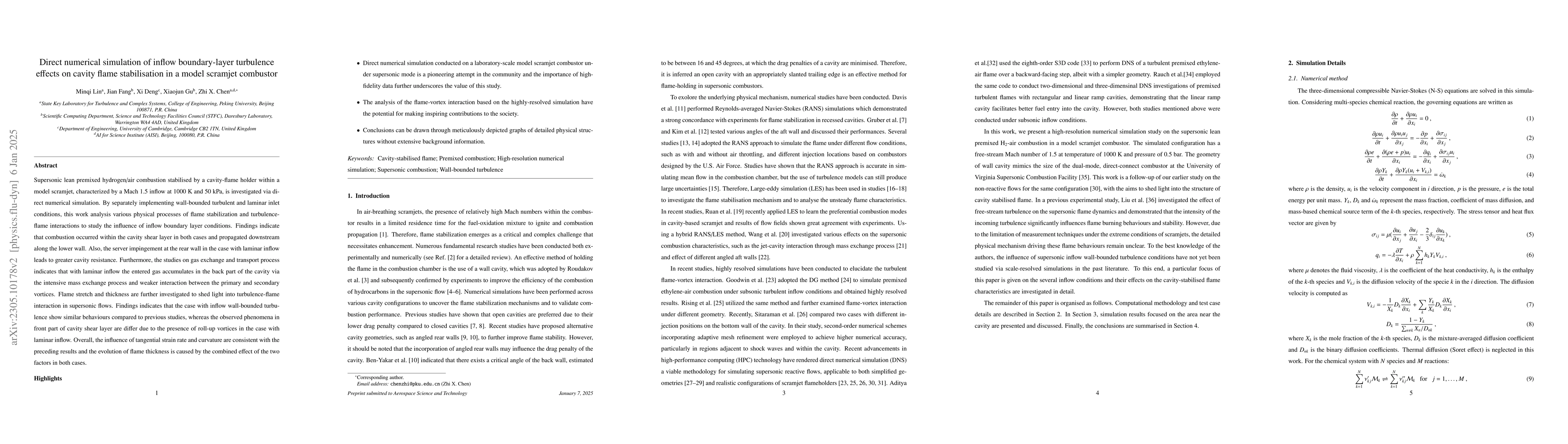 In this work, supersonic premixed H2/air combustion stabilised by a cavity flame-holder in a model scramjet combustor with a Mach 1.5 inflow is studied via direct numerical simulations. By applying turbulent and laminar inlet condition separately, we compare the flame stabilisation characteristics between these two cases to study the effect of inflow turbulence. The ignition and flame propagation process are similar in both cases.After combustion in the area near the cavity reaches quasi-stationary state, the results show that with inflow turbulence more robust vortices are developed in cavity shear layer and near the aft wall, resulting in a thicker reaction zone and larger flame surface which present more efficient combustion. In addition, the inlet turbulence enhances the entry of fresh mixture and this further supports flame stabilisation near the cavity. However, the fully developed cavity shear layer also leads to greater cavity resistance. As for the flame stabilization, with inlet turbulence more robust recirculation and stronger mass exchange process is observed and promote the radical transport. These results give a preliminary insight into the flame stabilization mechanism. The distribution of progress variable indicates that the flame stabilized toward products side with turbulent inlet.
